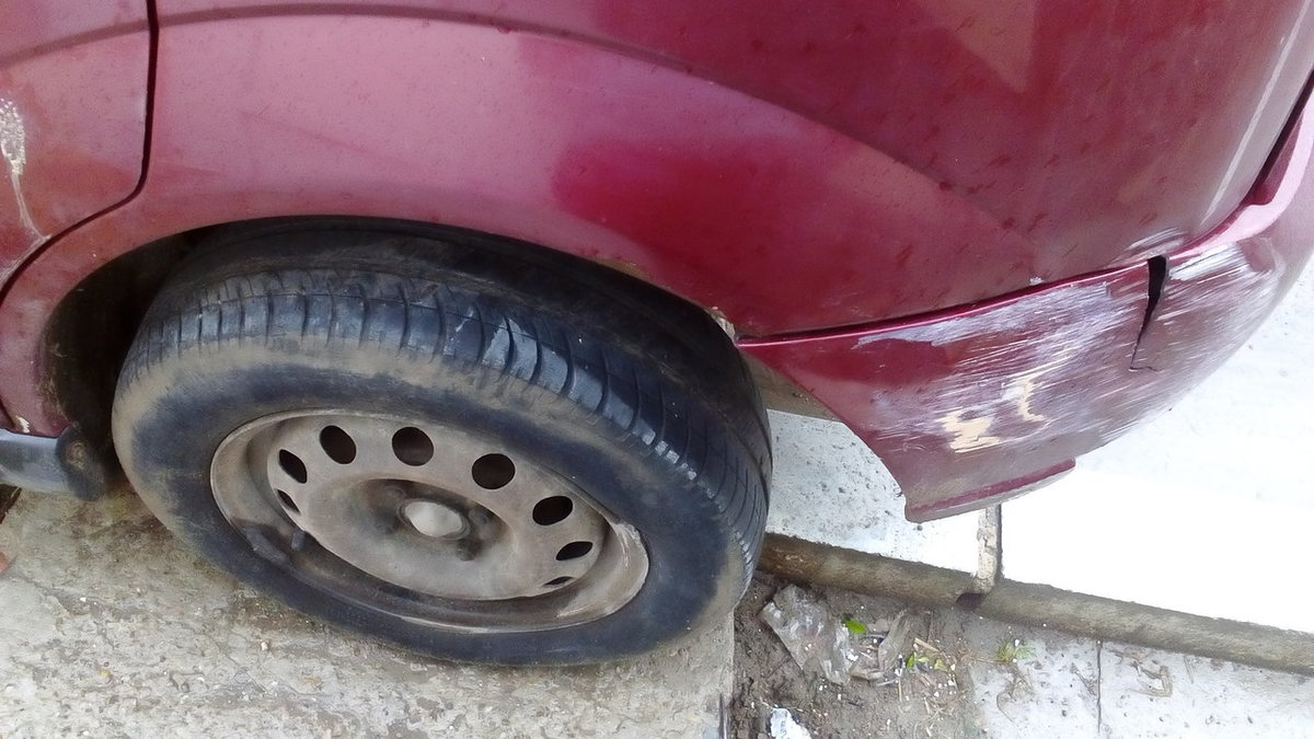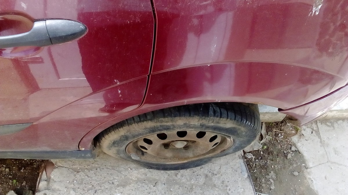 . Mașina a fost lovită în fața porții de un șofer cel puțin grăbit... Problema e că acum trebuie să scap de epavă și am primit o lovitură în moalele capului azi când cineva mi-a oferit 300 de euro pe epavă, în condițiile în care eu am dat 1400 de lei cu o săptămână înainte de a fi lovită pentru a înlocui discuri, plăcuțe, saboți și repararea ambelor planetare (cea din stânga este intactă, cea din dreapta e ruptă). Așa că încerc să obțin un preț cât mai bun pe ea, mi se pare barbar să oferi atât de puțin, în condițiile în care oricine o cumpără obține mai mult doar pe cutia de viteze, spre exemplu...
