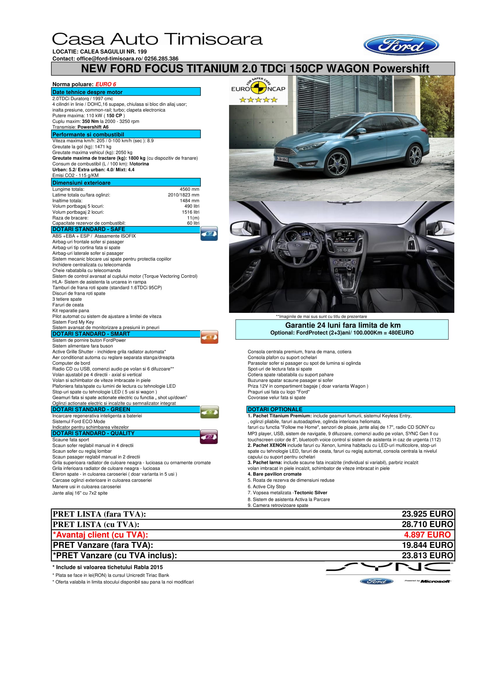 - pachet Titanium PREMIUM (include geamuri fumurii, sistemul Keyless Entry, oglinzi pliabile, faruri cu aprindere automata, oglinda interioara heliomata, faruri cu functia "Follow me Home", senzori de ploaie, jante aliaj de 17", radio CD SONY cu MP3 player, USB, sistem de navigatie cu harta Europei de Est si Vest, 9 difuzoare, comenzi audio pe volan, SYNC Gen II cu touchscreen color de 8", BlueTooth si Voice Control si Sistem de asistenta in caz de urgenta (112))
