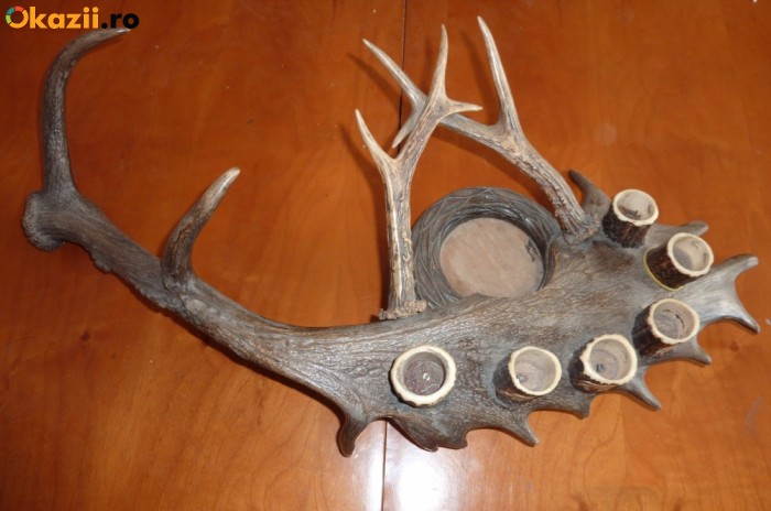 De vanzare o lucrare artizanala originala, de o eleganta aparte: set de servire tarie ( palinca sau rachiu ) confectionat din coarne de capra de munte si un corn de cerb lopatar; suporturile pt paharele sunt confectionate din os ( origine necunoscuta ). Pretul este 500 lei.