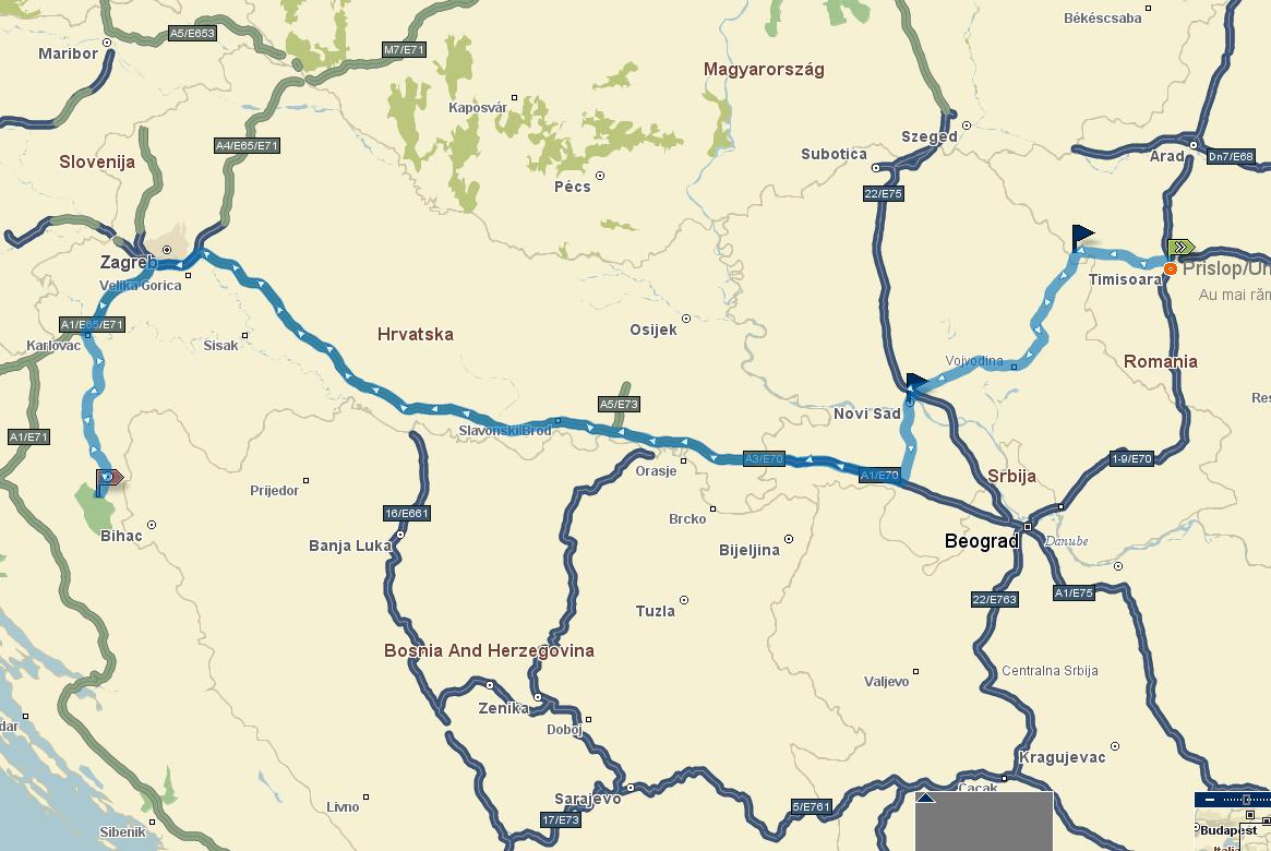 am mai aflat un pont: cica e mai convenabil pe ruta Timisoara-Jimbolia-Novi Sad si dincolo de Novi Sad sa intru pe autostrada Beolgrad-Zagreb (pe la Ruma). as scurtcircuita umpic bucla si as evita Belgradul.