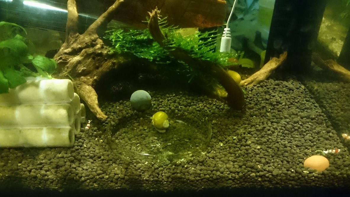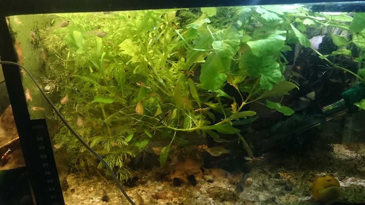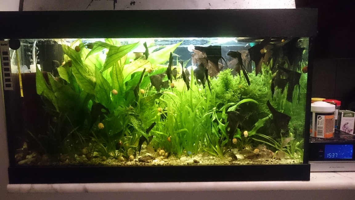 Asa e, nu am alge ca "intretin atmosfera" cu Easy Carbo ce are ca efect dizolvarea algelor. Am avut cateva pe geam verzi, dar -le sterg cu magnetul de geam. Fata de primele poze, am mai rarit plantele si le tund destul de des, aprox. la 7-8 zile. Pana acum nu am pierdut niciun peste, insa am acum multi melci, sunt pui dar cresc