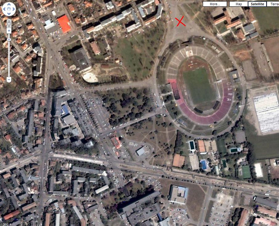 Pai eu propun in fata stadionului, acolo unde am marcat cu X rosu pe harta: