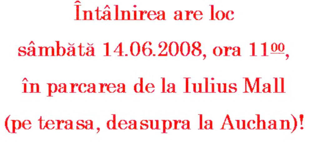 $1 scrie:$2color=#FF0000]Intalnirea are loc sambata 14.06.2008, ora 11:00, in parcarea de la Iulius Mall (pe terasa, deasupra la Auchan)![/color]