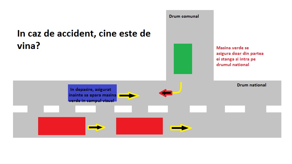 $1 scrie:$2u esti vinovatul daca se intampla accidentul ,pentru ca este interzisa depasirea intr-o intersectie nesemaforizata (nedirijata) .