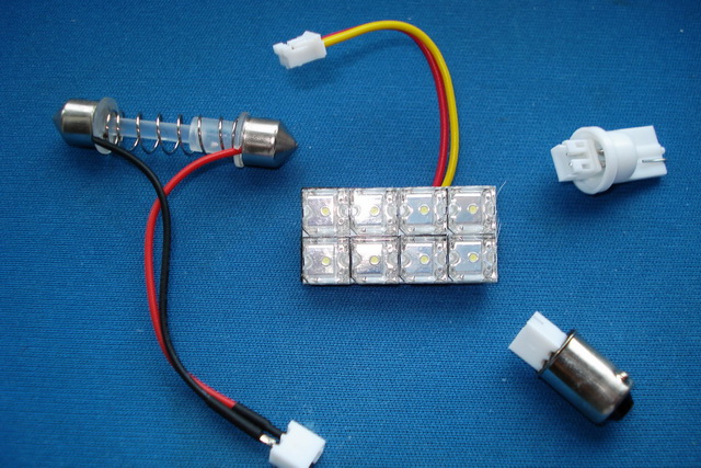 Bec Auto cu 8 LED-uri SMD contine adaptor pentru soclu C5W, W5W = 23lei/buc. - Functioneaza pentru majoritatea masinilor pretandu-se in special pentru montajul in plafoniere si inlocuieste cu succes becurile clasice care asigura iluminatul la picioare sau in torpedou. Consuma aprox. 1.3 W si ofera o lumina de cca. 25 ori mai mare decat cea a becurilor clasice. Culoare apropiata de cea a xenonului de 8000k.