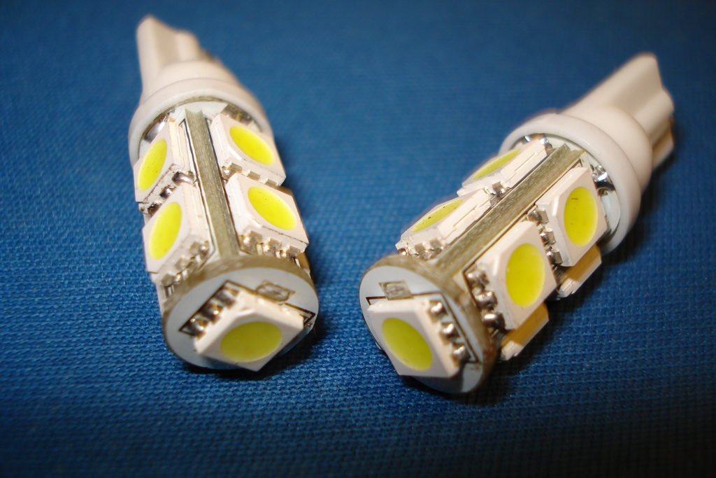 Bec Auto soclu W5W cu 13 LED-uri SMD(mici) = 45lei/setul de 2 buc. - Spre deosebire de varianta cu 5 si 9 leduri, exista un singur chip per led, iar soclul permite instalarea si folosirea lor ca becuri de pozitie. Consuma aprox. 1.3 W si ofera o lumina de cca. 25 ori mai mare decat cea a becurilor clasice. Culoare apropiata de cea a xenonului de 6000k.