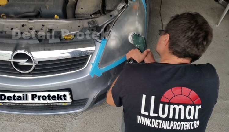 Slefuirea si polisharea acestor faruri de Opel Zafira s-a efectuat in atelierul Detail Protekt din Bucuresti - str. Veseliei nr 3-5/A (zona Trafic Greu). Folia de protectie aplicata pe aceste faruri este marca LLumar, 100% transparenta, are 240 microni grosime si este foarte elastica.