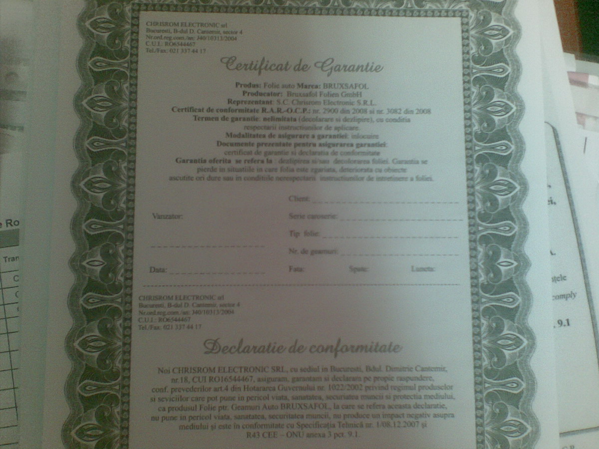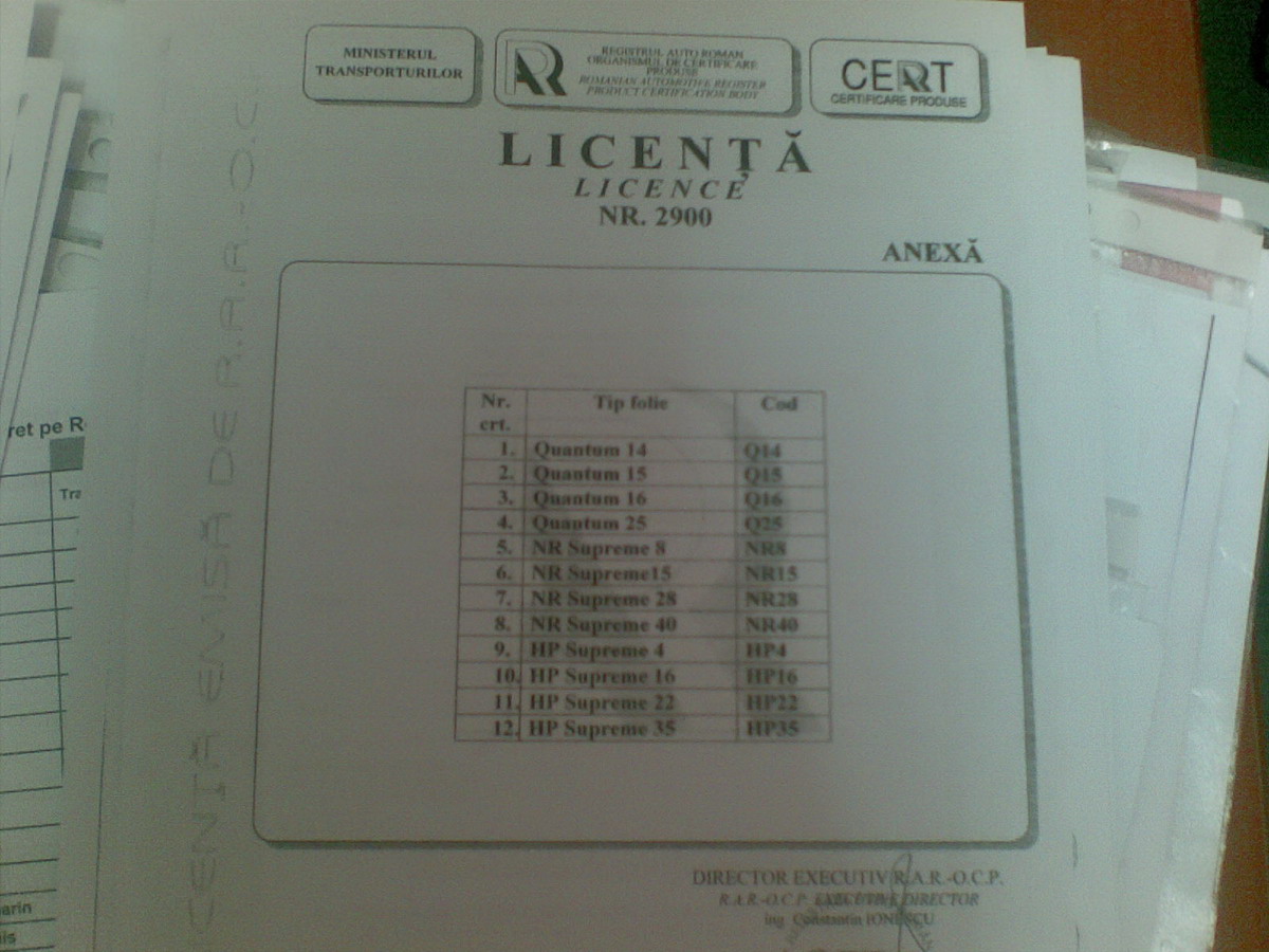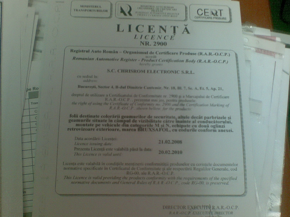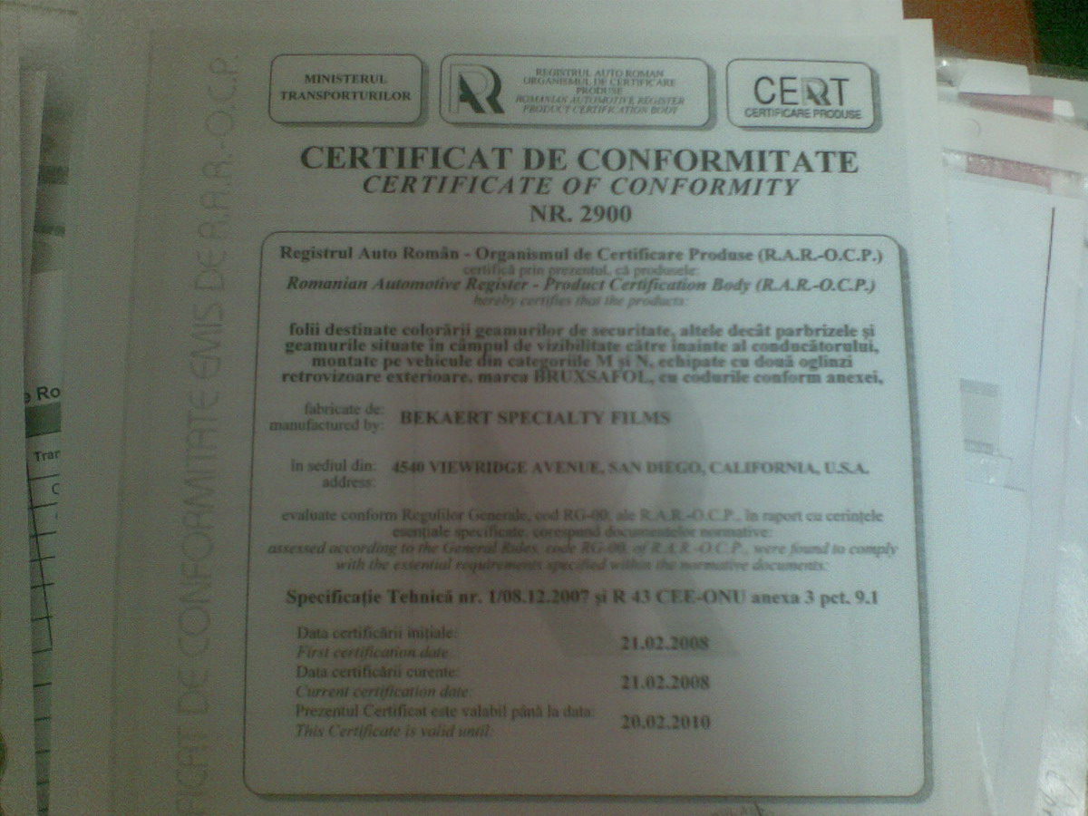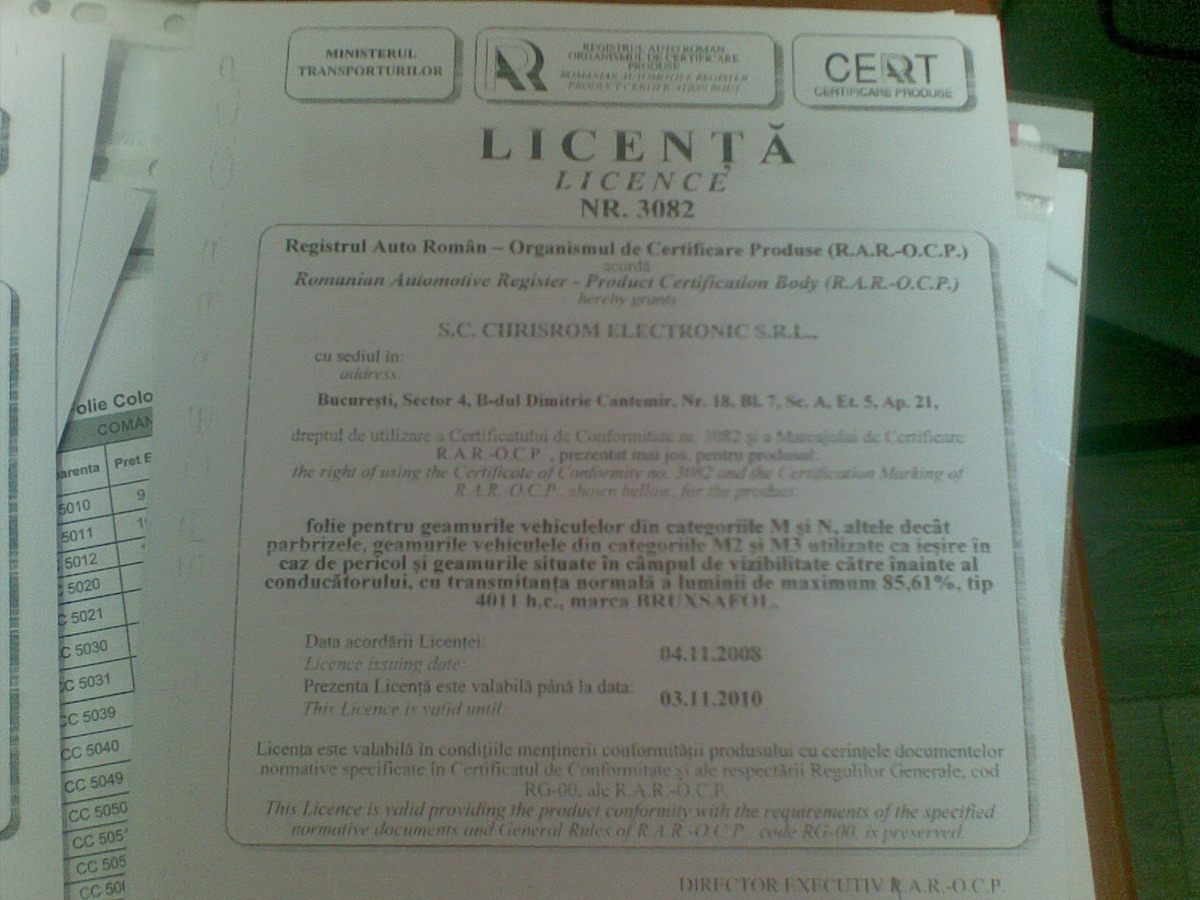 - modificarea transparentei geamurilor nu se inregistreaza in cartea de identitate a autovehiculului, insa atelierele autorizate sa efectueze operatiunea de aplicare a foliei colorate, trebuie sa elibereze un document privind certificatul de conformitate si licenta emisa de Organismul de Certificare Produse al Registrului Auto Roman, iar la inspectia tehnica periodica se verifica eticheta ce contine marca de omologare a geamului precum si gradul de transparenta.http://www.rarom.ro/RO/article--Foli...muri--203.html