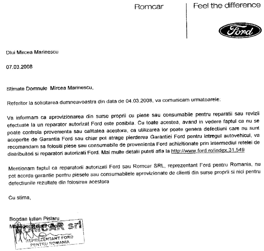$1 scrie:$2vem raspuns si de la Romcar SRL (importatorul oficial Ford). Tipic. Adica ai voie sa iei piese din alta parte dar nu lua ca poti sa pierzi garantia...