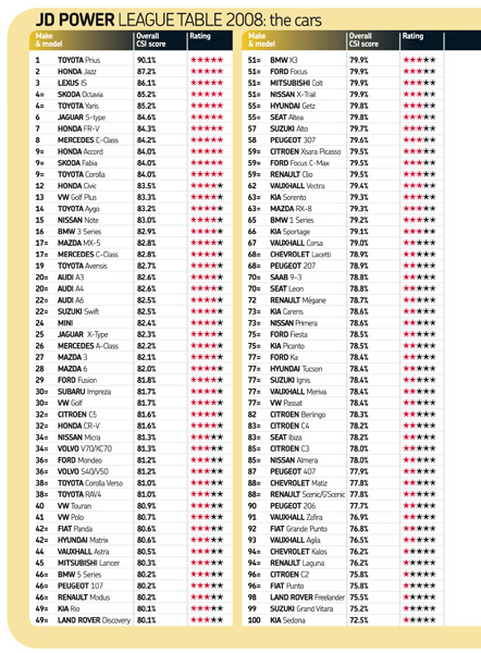 Din cite stiu eu JDPower realizeaza statistici cu gradul de satisfactie al posesorilor (soferilor) de autoturisme fata de masinile lor si nu fiabilitatea masinilor; eu unul nu am incredere in astfel de institutii si demersuri (vezi si EURONCAP) si mai ales in rezultate; acum 2 ani am citit acelasi lucru (aproape identic) cu privire la piata germana, in frunte fiind - ghiciti ce - toate marcile japoneze dar ghinionul a facut ca eu sa ma fi intors din DE de citeva saptamini si pot sa jur ca m-am cam chinuit sa vad pe strada (oras sau autobahn) si alta marca decit cele nemtesti, cu alte cuvinte nu vedeai decit BMW, AUDI, VW, FORD, OPEL, MERC si extrem de rar SEAT si SKODA, despre japoneze nici vorba... asa ca eu unul nu mai iau de bune nici un fel de statistici auto decit cele referitoare la vinzari.