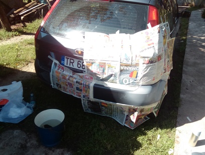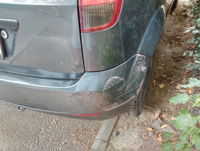 2. Am gasit-o lovita in parcare in fata blocului. Vopsea rosie. Nimic grav insa nu am vrut sa revopsesc toata bara asa ca m-am inarmat cu aerosol de calitate si lac mai putin calitativ asa ca a iesit cam mat. Oricum, e ok si o sa stau asa pana ma decid ce o sa fac (a primit multe zgarieturi cu cheia si mai mi-a picat pe plafon ceva dubios de s-a crapat vopseaua, deci probabil o sa o vopsesc integral in 1-2 ani).