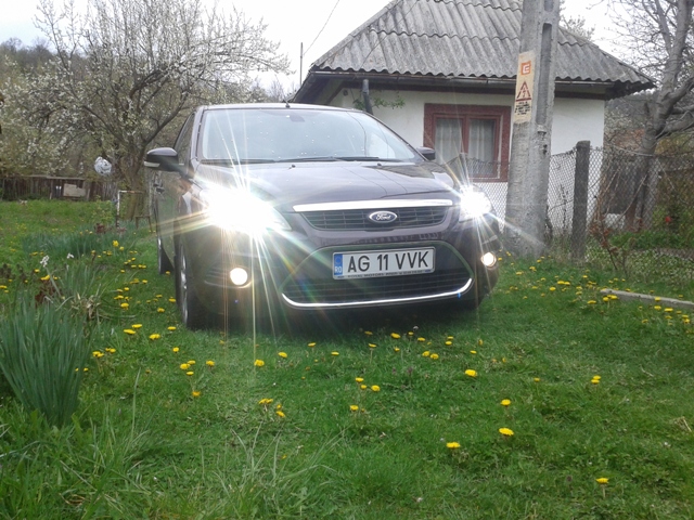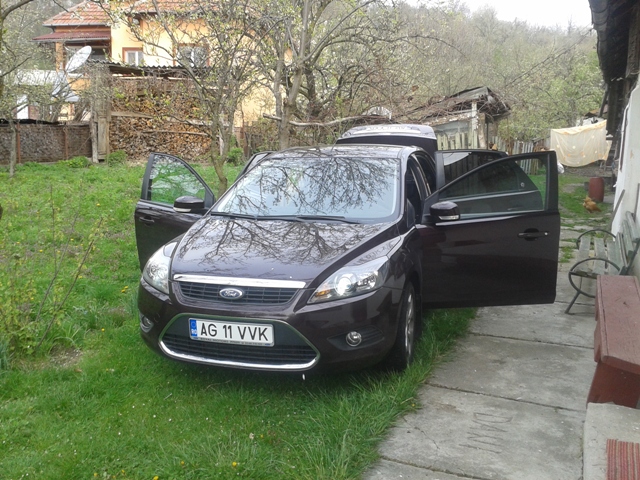 Cand am luat decizia sa achizitionam o masina personala (de foarte mult timp am masina de serviciu), stiam ca o sa fie Ford Focus sedan cat mai dotat. Mai avusesem contact cu un focus 1.4 sedan de la serviciu si un 1.6 90CP diesel hatch, pe care l-am cumparat de nou pentru cineva si deci nu concepeam alt model. La un moment dat, dupa ce vazusem destule masini si batusem netul in lung si-n lat, un amic, dealer de masini sh, mi-a spus ca are un focus si m-a invitat sa-l vad. Masina fusese luata la pachet cu mai multe utilitare(se terminase leasingul) si avea 60.000KM. Cand am auzit ca este trend si motor pe benzina, recunosc, nu m-a incantat. Dar dupa ce m-am mai gandit si am verificat-o la dealerul de unde fusese cumparata si servisata( oamenii mi-au spus ca o cunosc si ca nu a avut nici o problema) am decis sa o cumpar. Atasez o imagine de la prima intalnire: