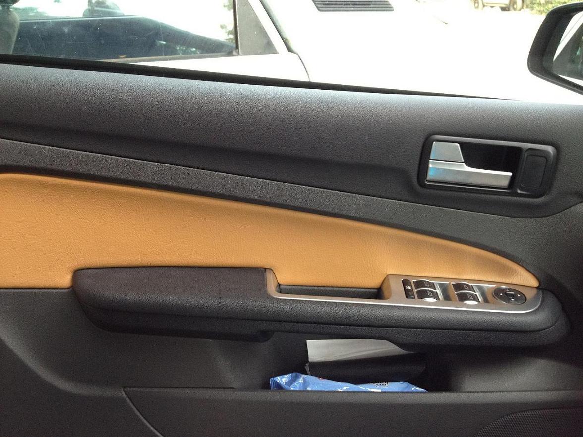 Poti pune te rog niste poze in cu fetele de usi? Arata interesant insertia de crom de pe manere. Are material textil sau piele pe partea maro a fetei de usa?