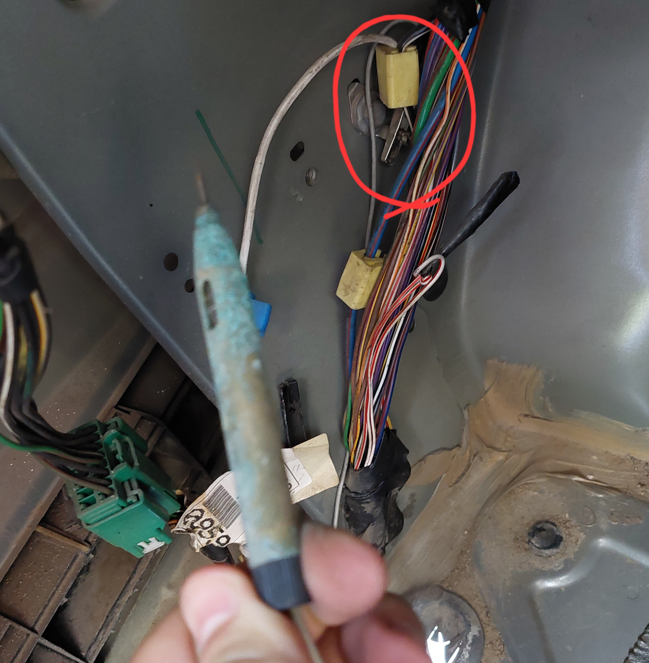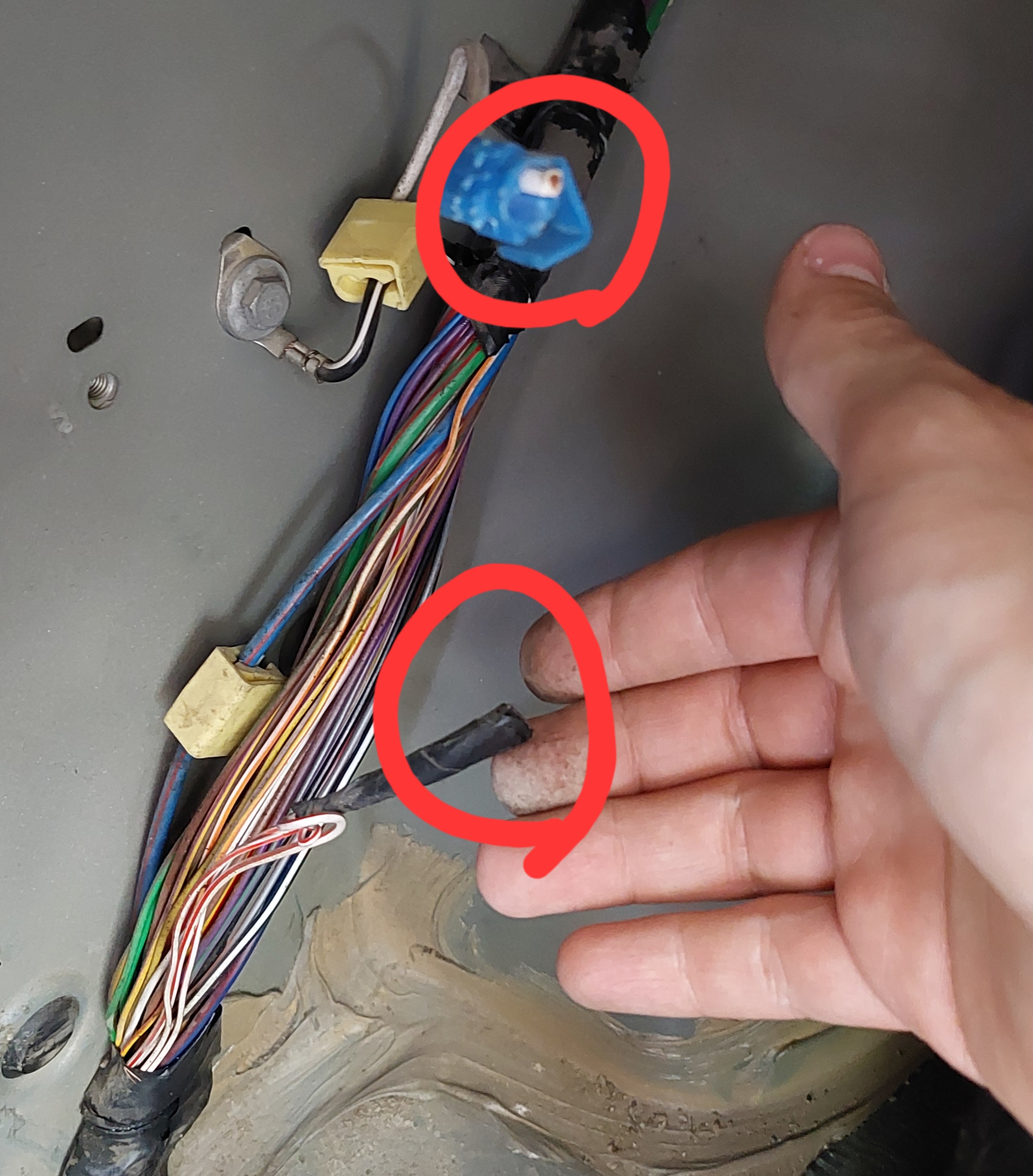Pe langa mult nisip si multe pietricele, si niste capace pe care va trebui sa caut prin SH sa le schimb, am descoperit si resturi de cabluri taiate pe partea stanga. Si o "scula" care am uitat cum se cheama, care era prinsa de masa pe caroserie (poza 2), si cred ca uitata acolo de cine a lucrat. Apoi sunt doua fire taiate (poza 1), cumva asa a plecat masina din fabrica? De la ce ar putea fi acel fir, unde are clipsul albastru?