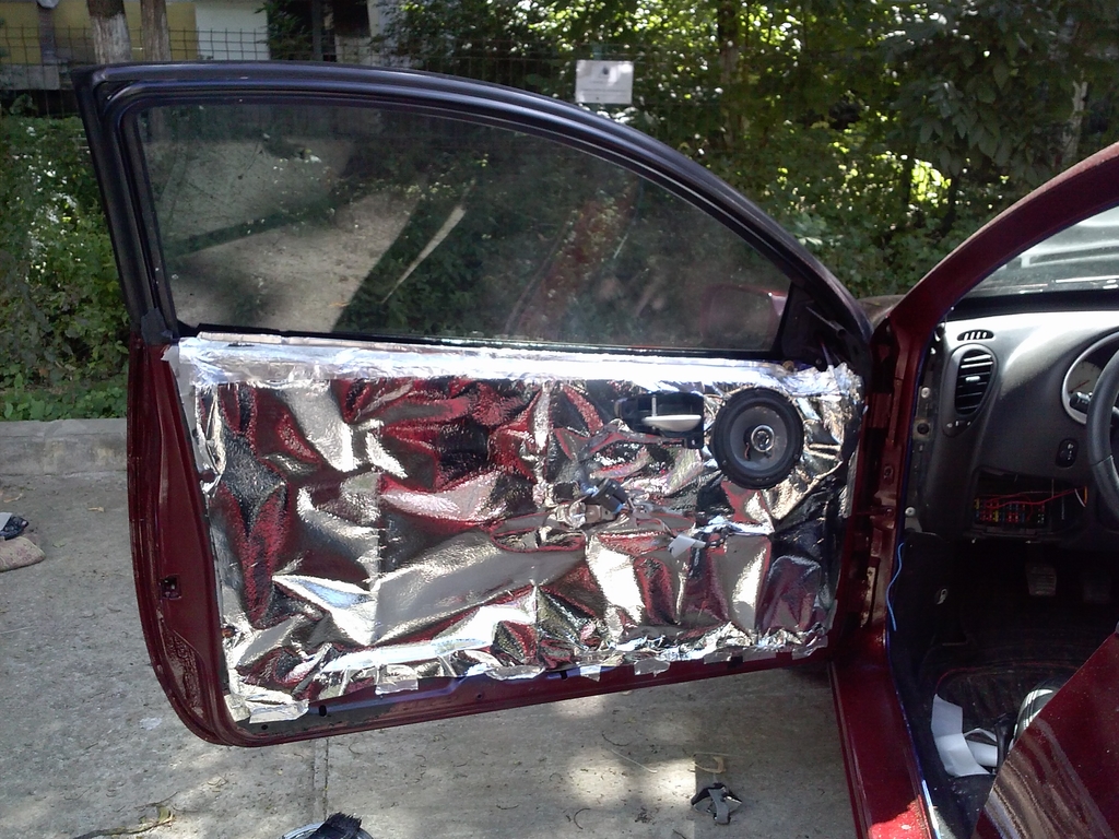 Am taiat 4 bucati, doua si doua si am pus prima cu aluminiu spre exterior si stratul doi cu aluminiu spre interior, asa si insonorizeaza si izoleaza.