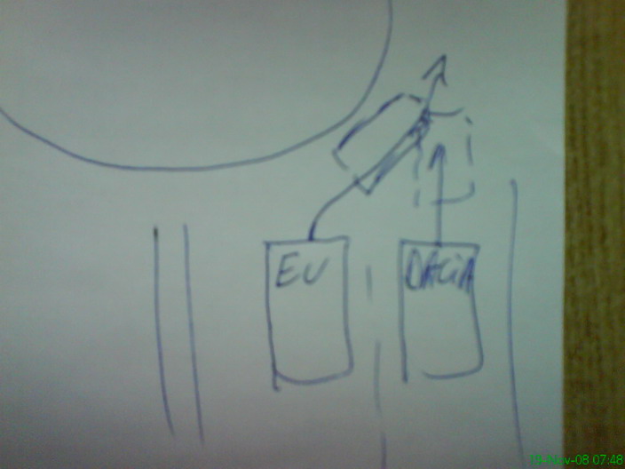 Am dat prioritate celor din sens si apoi am plecat hotarit rotind usor de volan spre dreapta (vezi foto care e facuta din aceiasi pozitie in care eram aseara ) ca sa ocolesc rondoul ...in urmatoarea secunda buuuf , i-am frecat bara unuia cu o dacie break care ,plecind odata cu mine de pe banda 1 , a considerat ca nu-i cazu sa faca si el dreapta de volan ci e mult mai simplu sa treaca direct prin sensul giratoriu .19 Noi 2008, 15:56