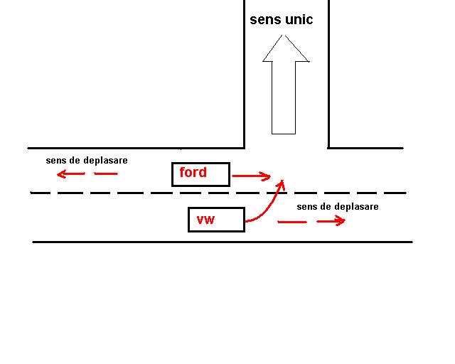 Eu asa inteleg ca s-a intamplat. VW a iesit in bulevard de pe o strada cu sens unic numai ca se afla in sensul gresit. Fordul era in bulevard si dadea cu spatele.
