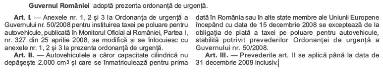 http://www.monitoruloficial.ro/RO/artic ... --297.html de aici puteti downloada de pe site-ul monitorului oficial numarul de ieri( sa schimbati data din 9 dec in 8 dec din calendar) din monitorul oficial in care e scrisa ordonanta de urgenta ce prevede ca se schimba taxele( anexele) din OUG 50/2008 de pe data de 8 decembrie si ca de pe data de 15 dec 2008 pana pe 31 dec 2009 orice autoturism inmatriculat pt prima data in Ro sau in spatiul european, care are sub 2000 cmc, este scutit de la taxa stabilita de OUG 50/2008. Deci, a schimbat taxa si apoi a anulat-o.
