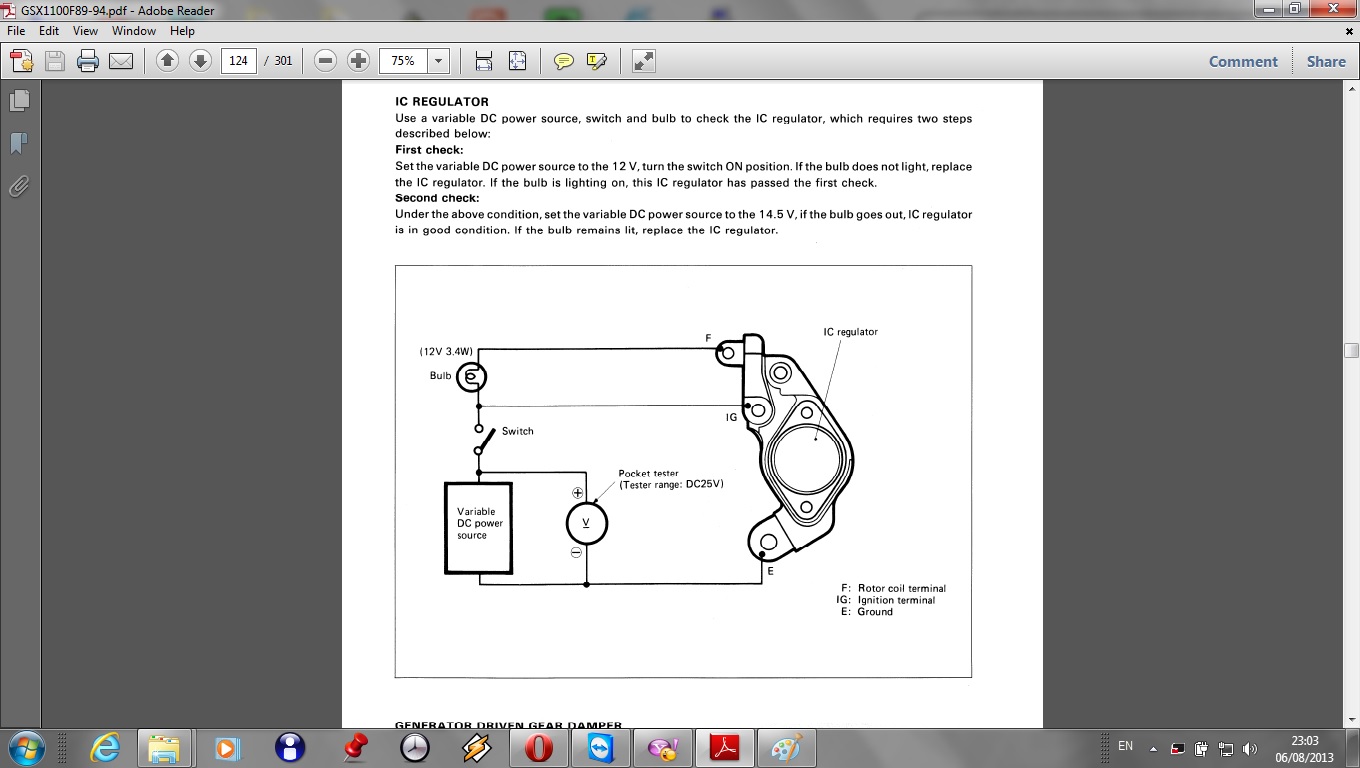 Poate ca totusi n-am nevoie de grafica: pe schema de test a regulatorului, E este masa si se conecteaza la minusul sursei de test ( ca in practica la masina). F si IG se conecteaza la plusul sursei, dar F dupa bec. Asta inseamna ca atunci cand inchizi circuitul, becul se va aprinde doar daca trece curentul prin regulator, excitat fiind de plusul din IG. Chiar daca pe IG nu este tensiune (fata de E) becul tot trebuie sa se aprinda, simuland incarcarea unei baterii complet descarcate. Dar daca pe IG tensiunea este de 14,2V sau mai mult, regulatorul ar trebui sa stinga becul, sa nu mai dea voie curentului sa treaca- adica sa opreasca incarcarea.