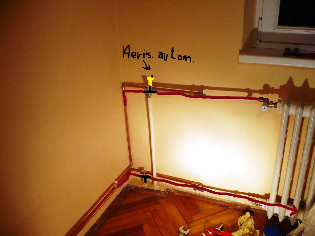 Repet: tot ce vezi de pexal cu caloriferul de fonta este circuitul cel vechi, functioneaza, incalzeste, se aeriseste, nu picura, n-are nici o problema, deci intentia mea a fost sa-l deranjez cat mai putin. N-avea nici un rost sa desfac un teu de pexal care sta bine si nu curge de ani de zile...
