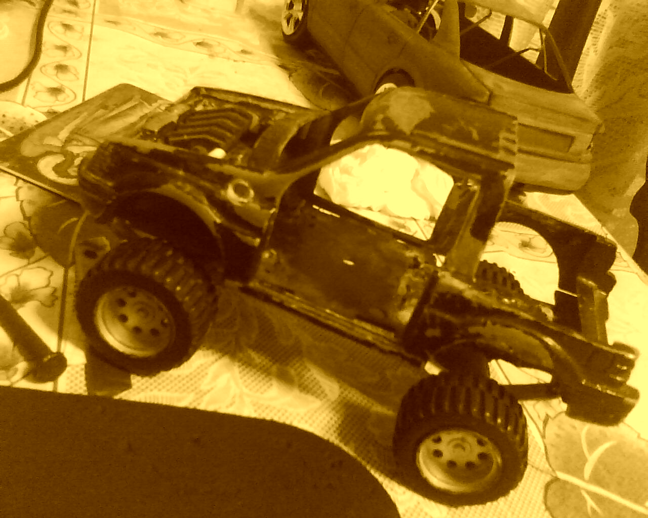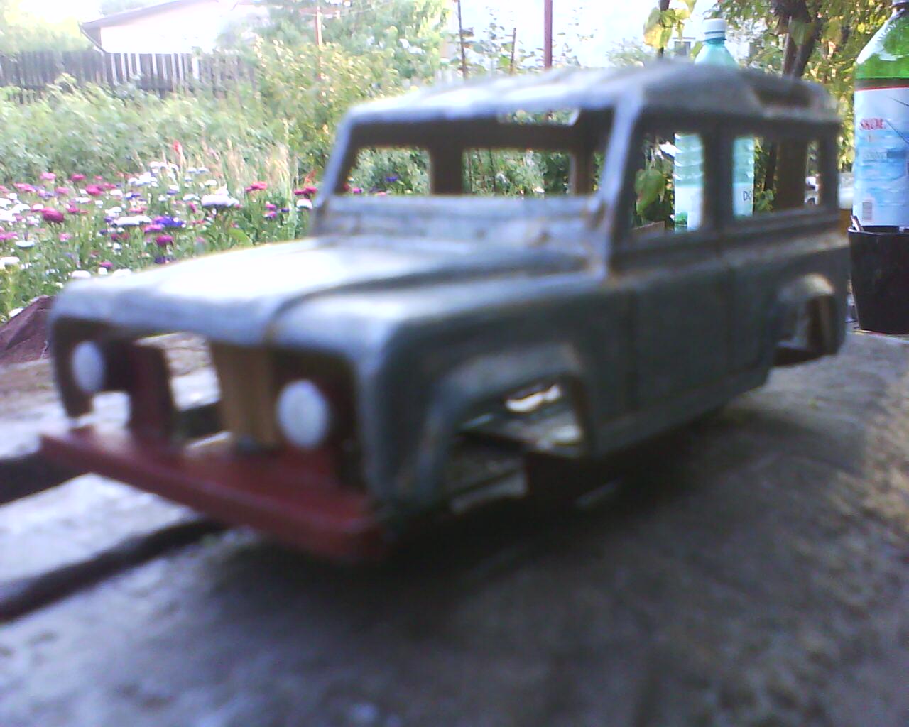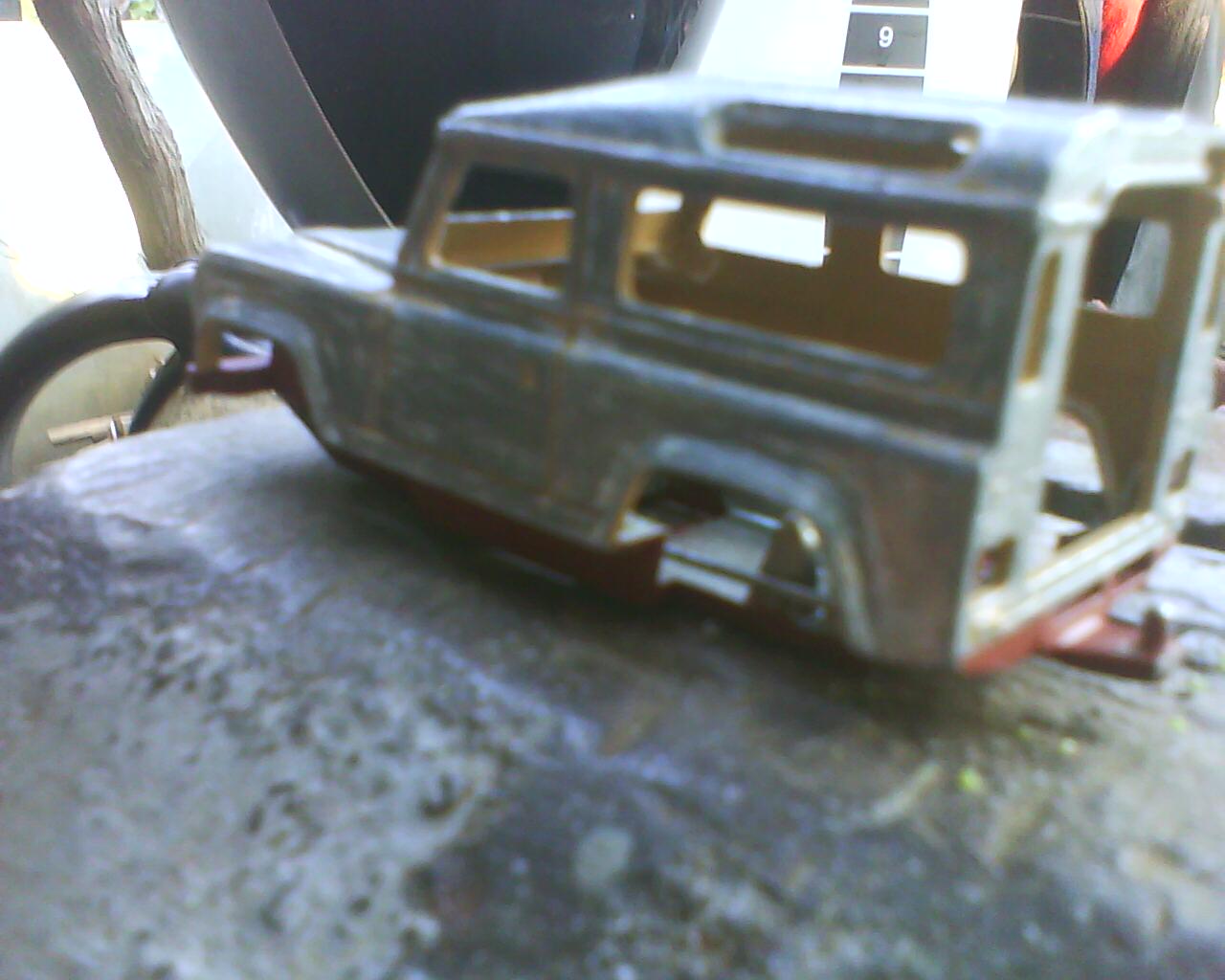 Cand l-am luat ii lipseau capotele, o usa, motoru', farurile si grila. I-am taiat acoperisu', i-am facut suspensii tip arc cu foi, punti rigide, i-am pus niste roti mai maricele, inca lucrez la un motor, i-am facut un snorkel(care nu e montat in poza) si l-am vopsit de cateva ori. Acum e grunduit, asteapta o culoare marfa.