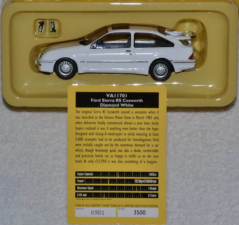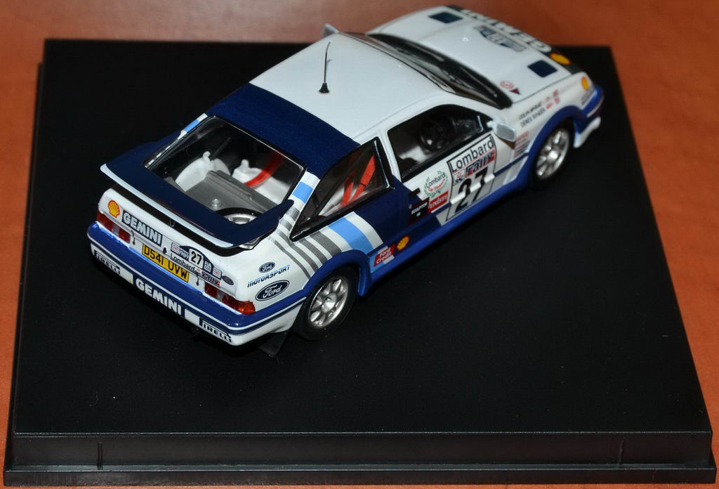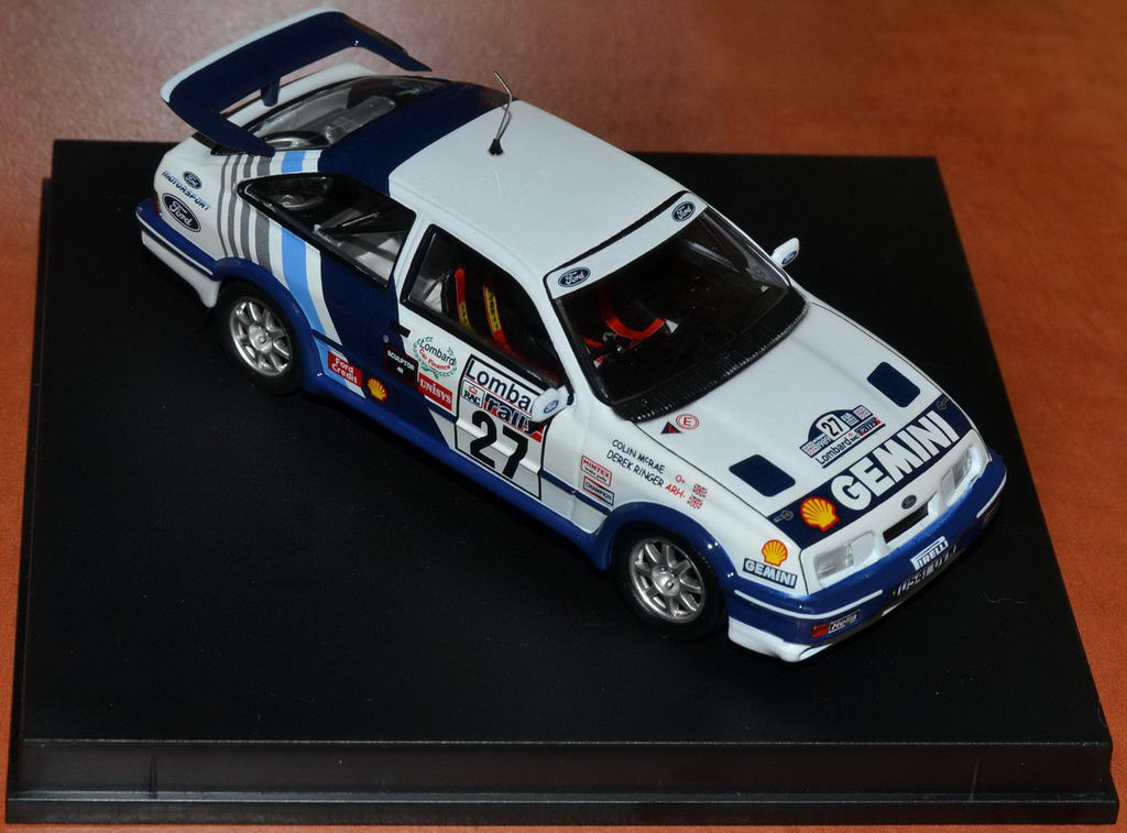 Mai am un RS Cosworth mare argintiu la care mai am de corectat un mic defect de caroserie(am mai corectat cateva ) si trebe sa ii dau o vopsea noua(ma gandesc ca sa il fac si p-asta gen street tuning, cu decals-uri, neoane si tot tacamu' ), 2 Escort-uri RS Cosworth 1:57(unu' Matchbox care este grunduit si ashteapta vopsea si cel Guisval care trebe desfacut, curatzat, construit stalp si vopsit ) si mai este un Escort Mk2 Matchbox care e un pic pic pic turtit la acoperish(asa a fost cumparat ), dar pe care il las asa deoarece a fost revopsit galben fara sa fie desfacut si daca e sa ma bag sa-l indrept trebe sa il desfac si nu vreau.