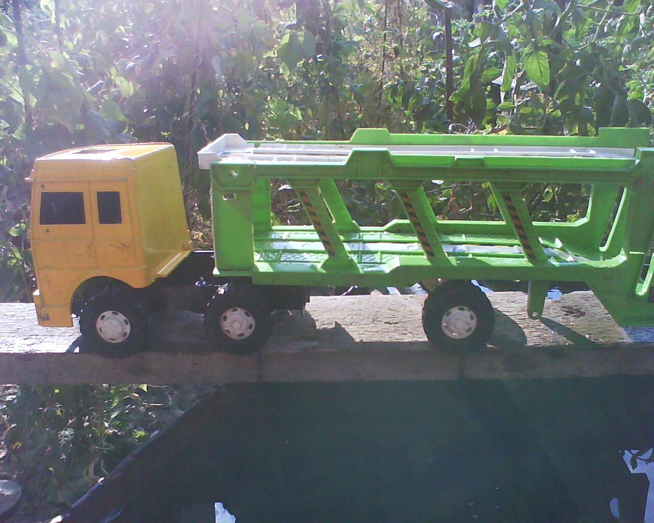 Este vorba de un camion de jucarie de 2 bani din plastic, chinezarie de tot rahatu' care nu m-a costat nici un leu(nu stiu de unde il am, statea pe undeva prin ceva dulap demult uitat ). Un TIR cu semiremorca trailer q 2 niveluri.