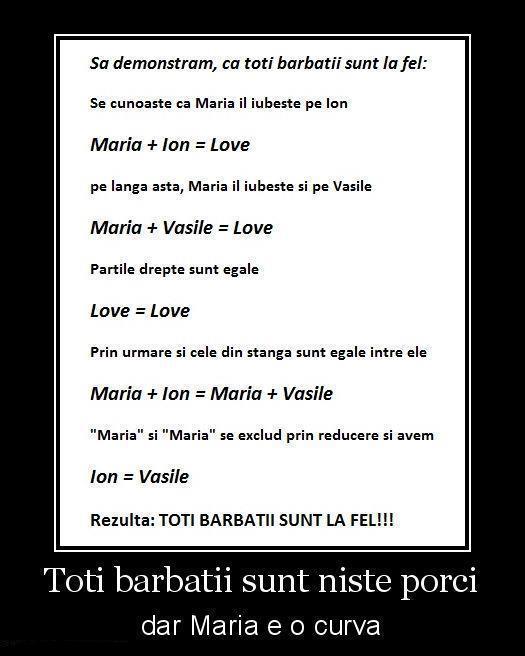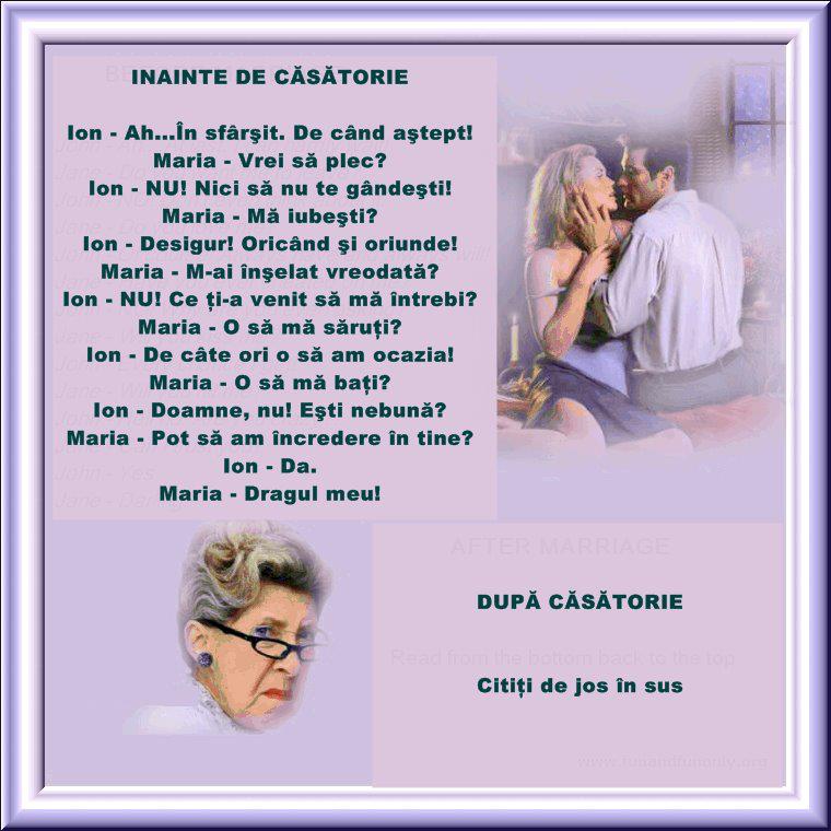 "Dragul meu sot, am primit faxul tau si nu pot decit sa-ti multumesc ca m-ai anuntat. Profit de aceasta ocazie sa iti reamintesc ca si tu ai tot 54 de ani. In acelasi timp, te anunt ca atunci cand vei citi acest mesaj, eu voi fi in mijlocul unei partide de sex la Grand Hotel cu John, profesorul meu de tenis care, la fel ca si secretara ta, are tot 18 ani. Si cum, pe langa faptul ca esti un om de afaceri de succes esti si licentiat in matematica, vei intelege cu usurinta ca ne aflam in aceleasi imprejurari, dar... cu o mica diferenta: 18 intra de mai multe ori in 54 decit 54 in 18.