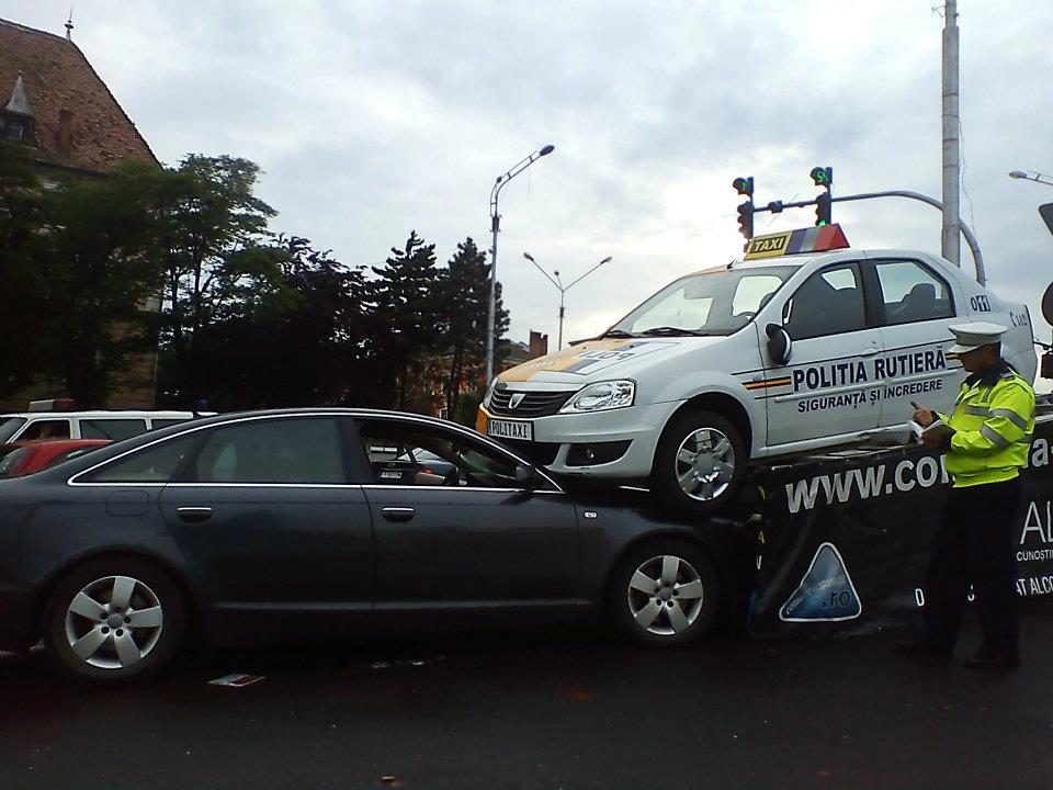 Campania Politiei "Consuma responsabil" din Sibiu s-a transformat in Campania "Tamponeaza responsabil". Omul nu a stiu ce sa aleaga asa ca a lovit si masina de Politie si cea de taxi! Asta e numa mana lui Nic_Bv