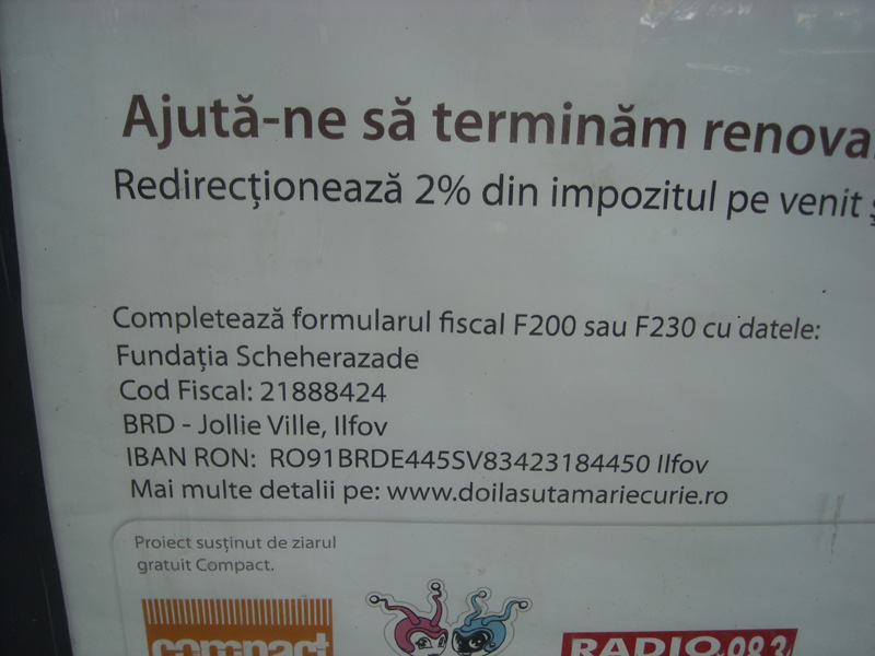 -"renovarea Spitalului “Marie Curie” din Bucuresti (Fundaţia Scheherazade, codul de identificare fiscală 21888424 şi contul bancar IBAN, RO 91 BRDE 445 SV83423184450)"