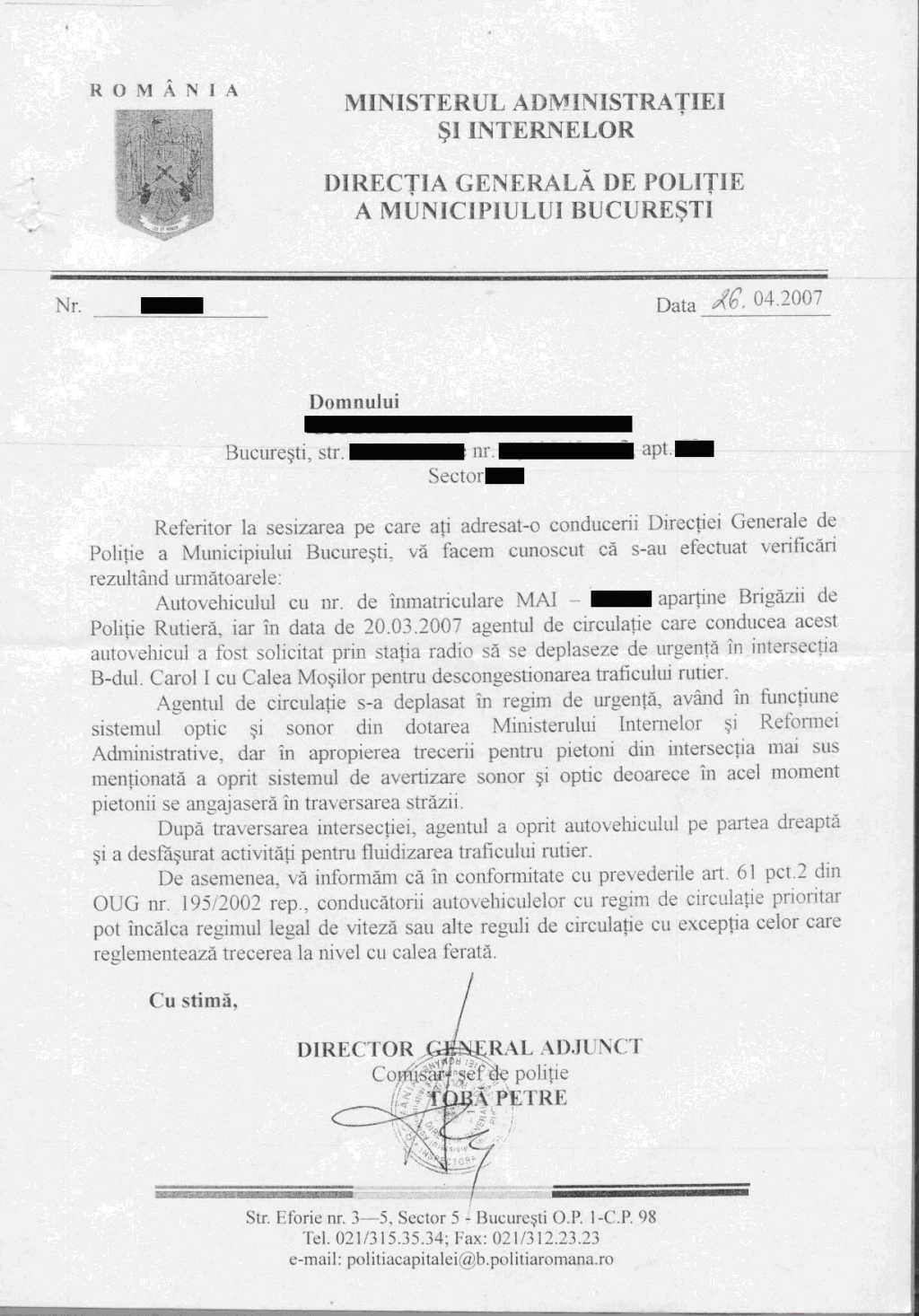 ÃŽn data de 24 martie 2007 am adresat un memoriu D.G.P.M.B. (pe care îl anexez, împreună cu răspunsul primit) în care arătam (cu poze ÅŸi martori) încălcarea legii de către conducătorul autovehiculului PoliÅ£iei înmatriculat cu numărul MAI 00000. Răspunsul D.G.P.M.B. a fost pueril, spunând că în ciuda celor văzute de mine ÅŸi de martori, precum ÅŸi a fotografiilor, “agentul s-a deplasat in regim de urgenţă, având în funcÅ£iune sistemul optic si sonor din dotarea M.I.R.A., dar în apropierea trecerii pentru pietoni din intersecÅ£ia mai sus menÅ£ionată a oprit sistemul de avertizare sonor si optic deoarece în acel moment pietonii se angajaseră în traversarea străzii”.