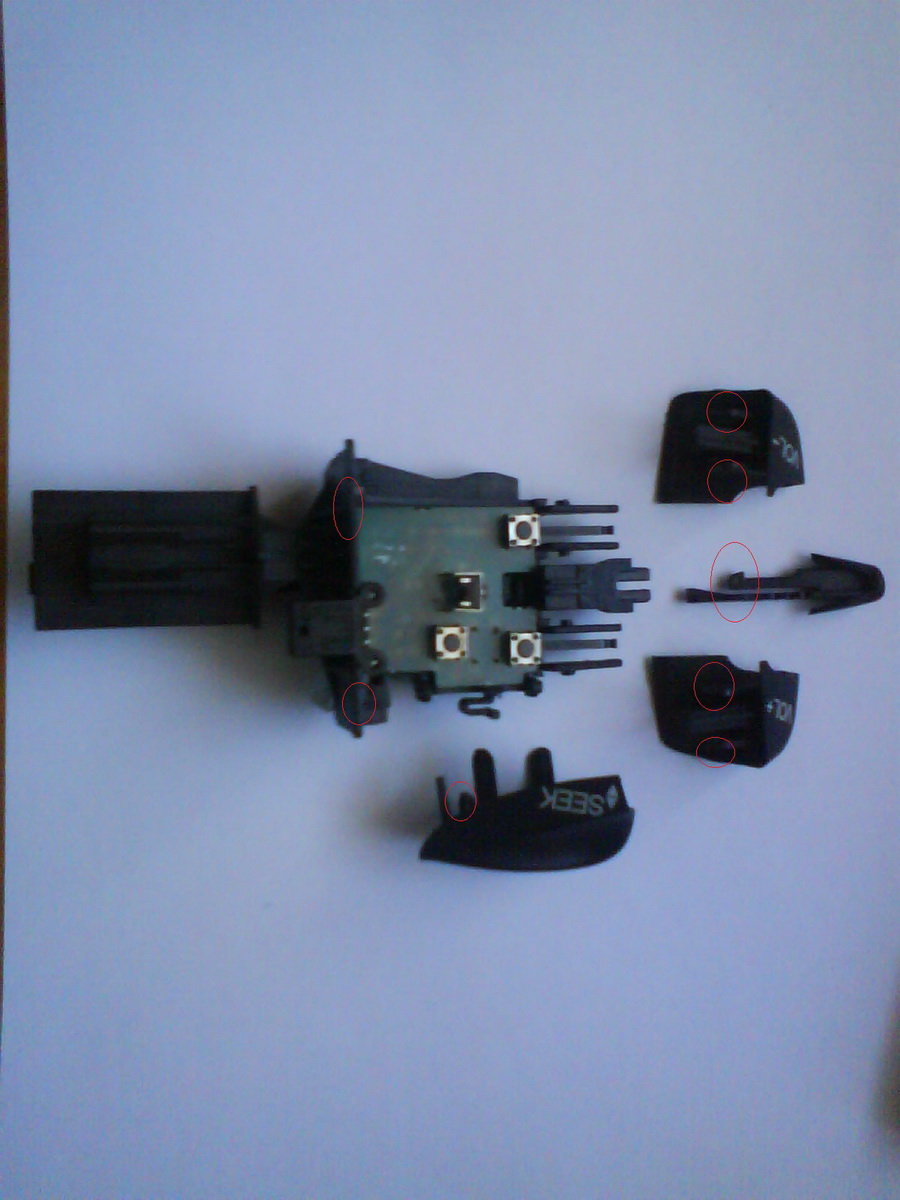 Am incercuit zonele unde se afla clemele de prindere. Prima data trebuie scoase butoanele si apoi iasa carcasa. O sa ai nevoie de o surubelnita subtire pentru a intra in spatiul dintre buton si carcasa. Sa ai grija sa nu rupi piciorusele ca eu am rupt unul:) Bafta