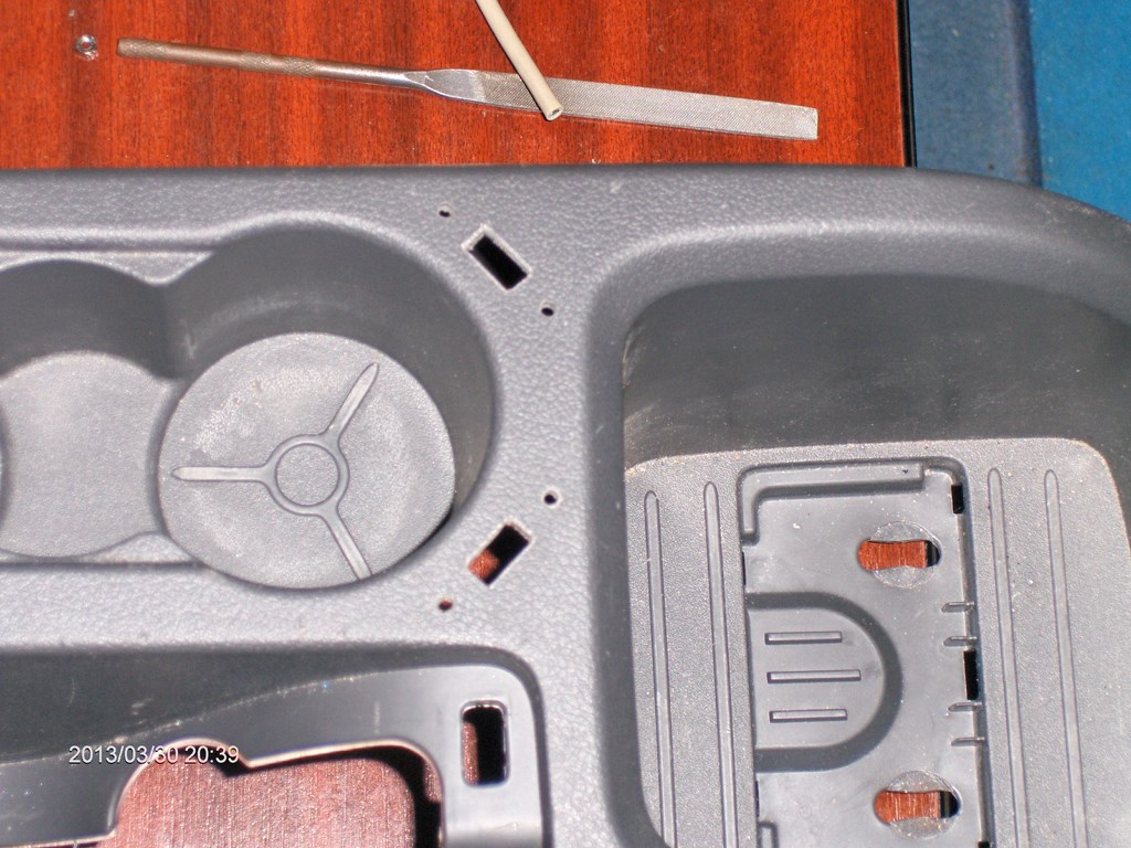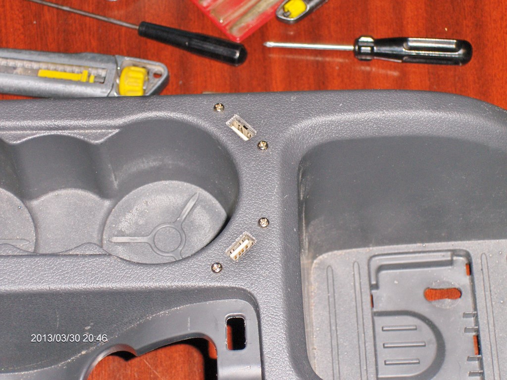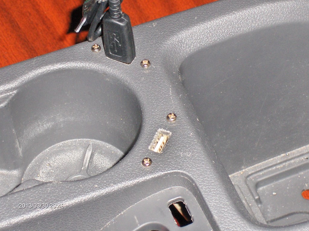 ), am hotarat ca 2 porturi USB fixe sunt solutia. Zis si facut. Am cautat in "cutia cu maimute" 2 porturi USB dintr-un calculator canibalizat, le-am desfacut de pe placuta de metal si m-am apucat sa vad unde ar avea loc pe consola centrala. Dupa cateva incercari, fetele, cu simtul lor estetic, au stabilit pozitia finala si m-am apucat de gaurit: