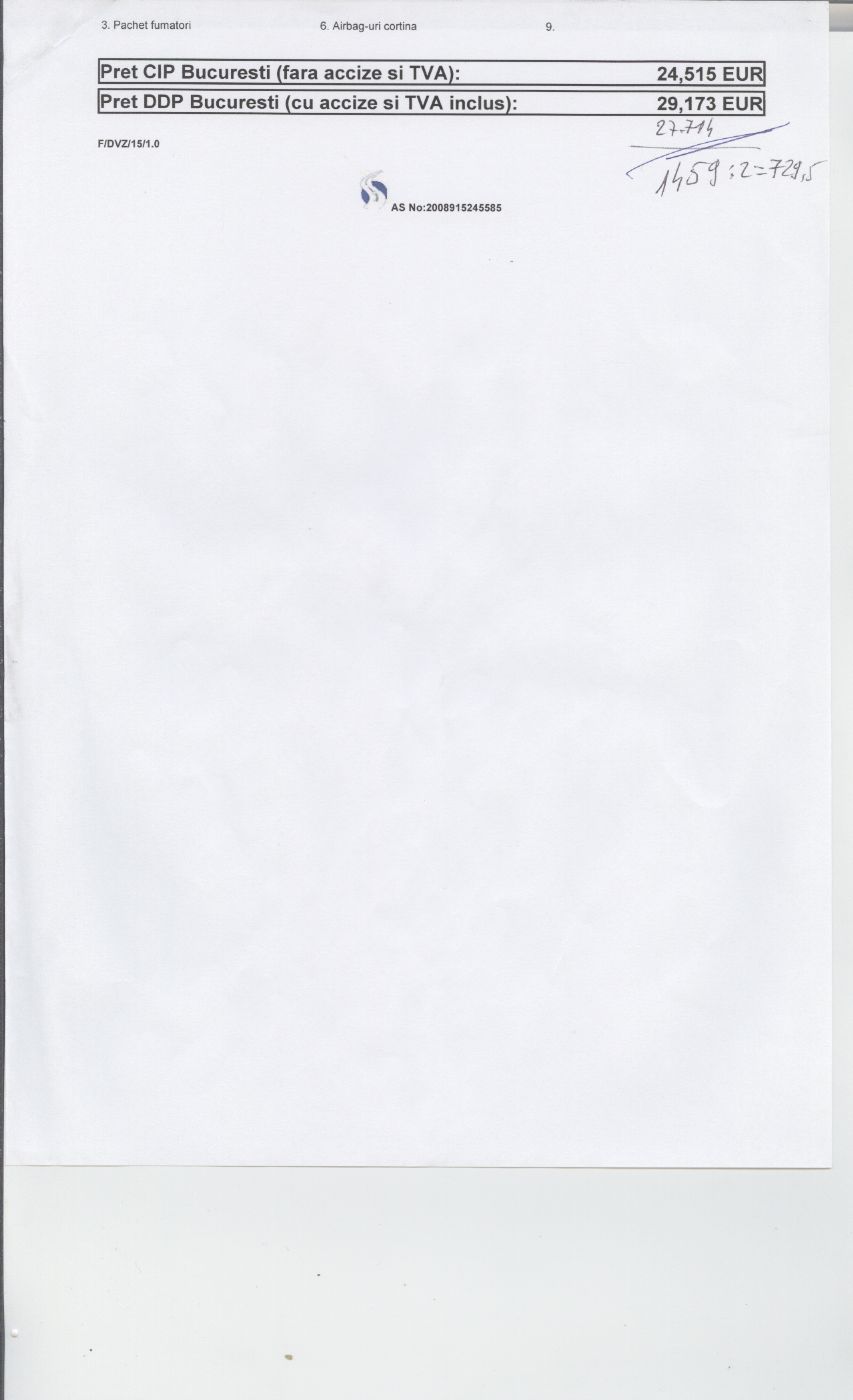 Deci il cedez,nu am nici o pretentie financiara.contractul este facut pe 5 ani,cu 60 de rate din care s-au achitat 5.Avans platit 7000 Euro.Taxa de poluare achitata.Taxa de inmatriculare achitata.Rata pe luna vine 469 euro.Alarma Viper achitata.Reviziile sunt facute la timp la Romcar.Kilometri la bord 2700.valoarea reziduala este inclusa in rata.