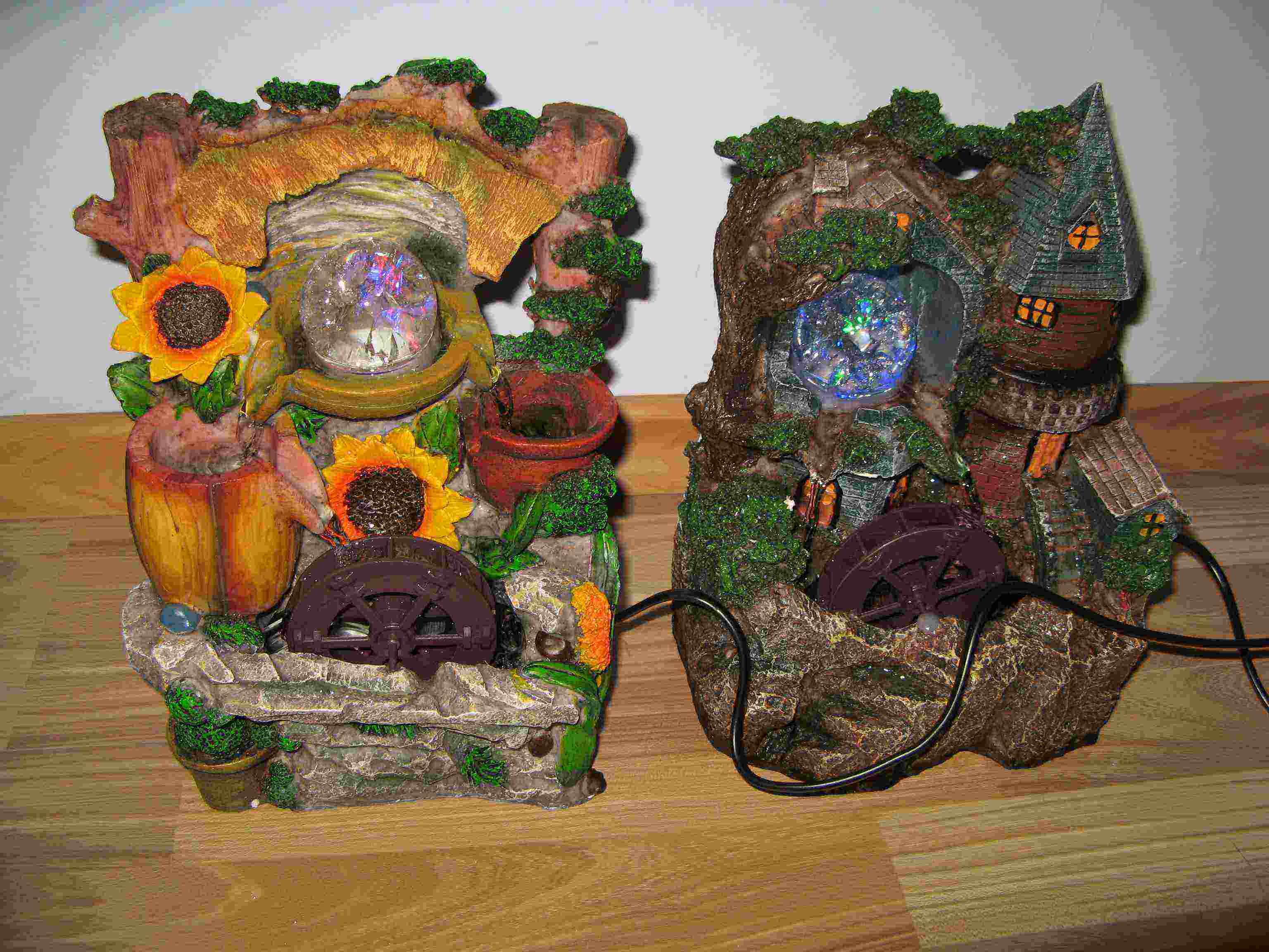 Fantanile sunt noi se pot vedea si in poza sau in video -se incarca cu apa cu 0,6 L -se baga in priza -ofera un joc de lumini si de apa -din cate am inteles purifica si aerul din incapere click pe link-u de jos pentru a vedea fantanile