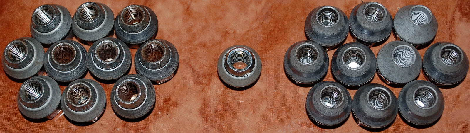 Adaug si piulitele de la roti, sunt folosite, si sunt de 2 tipuri: cu saiba rotativa si fara. Pentru a elimina anumite suspiciuni, sunt de la rotile mele de iarna, nu am ce face cu 40 de piulite in acest moment. Si tot pentru a elimina ideile gresite, va pot spune cu certitudine ca atat cele cu saiba rotativa cat si celelalte sunt pentru jante de aliaj.