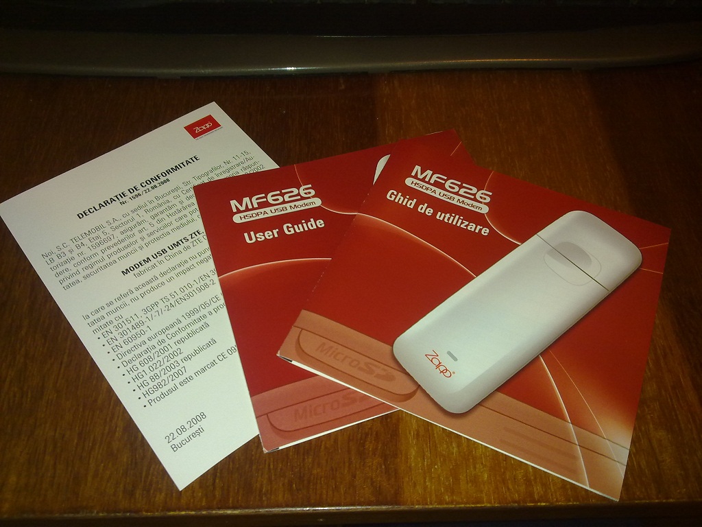 Modemul a fost cumparat de la Zapp acum un an. A fost folosit doar de proba, starea lui fiind impecabila. Pachetul este complet si include modemul, cablu usb, manual utilizare (rom+eng), certificat de conformitate, cutie. Modemul este codat in reteaua Zapp dar la cerere se poate decoda fara nici un cost suplimentar.