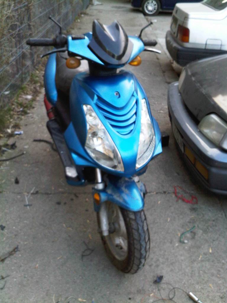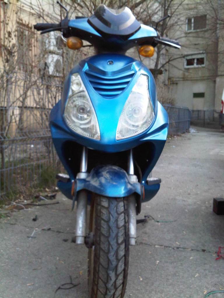 Vand scuter 50cmc in 4 timpi, cu set de 80cmc, dar inregistrat la primarie pe 50cmc, cdi racing, role de demaraj, angel-eyes, culoare albastru metalizat, 2 casti, piese de schimb: faruri, setul de 50cmc, carburator, amortizoare fata etc... uleiul si bobina de inductie schimbare azi...pret 1000 ron negociabil.