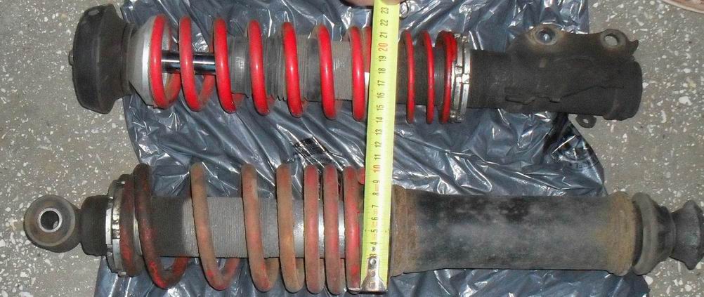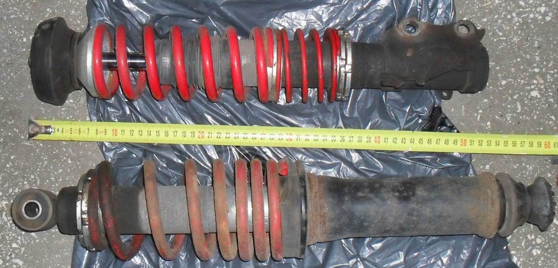 Un cunoscut de-al meu are de vandut aceste subansambluri, despre care crede ca ar fi suspenii sport; nu ma pricep, n-am idee in ce masura se pune problema de compatibilitate; nu stie nici el , asa cum nu stiu nici eu, de pe ce masina au fost demontate (exista motive sa credem ca de pe un Opel Vectra) - tot ce m-a dus mintea a fost sa le fac poza din care sa reiasa, orientativ, cat sunt de lungi si de groase.