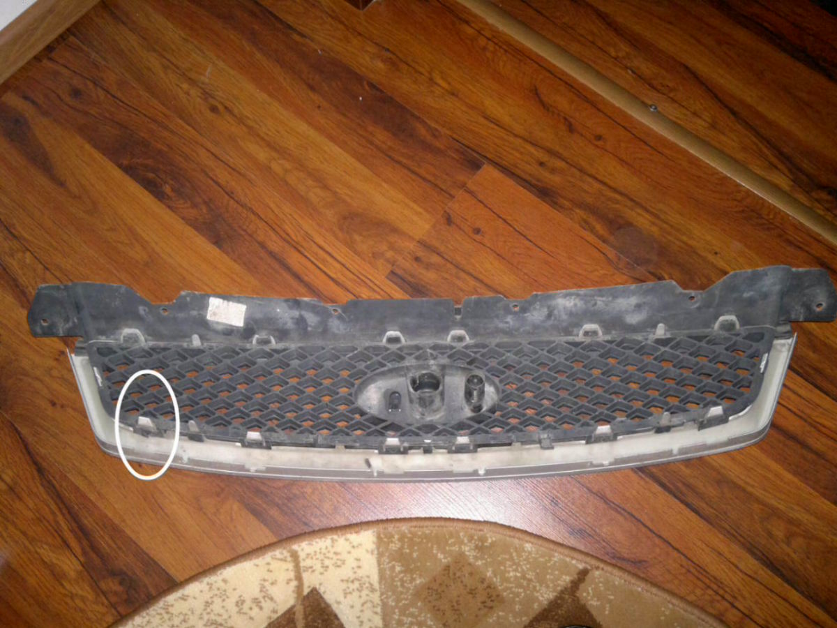 Are o singura problema minora- unul din locasurile in care intra clemele e crapat ( clemele din spate ce prind rama de grila ), cel incercuit in poza , dar nu afecteaza absolut deloc, prinde chiar si asta f bine.
