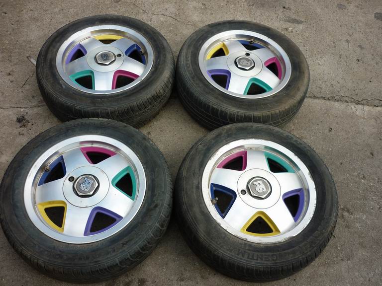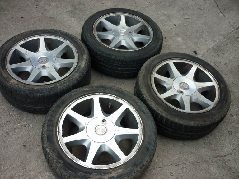 Set 2: 15 inch, 4x108, cauciucuri de vara 195/50 R15, lipseste un capac. Pret: 350 RON.