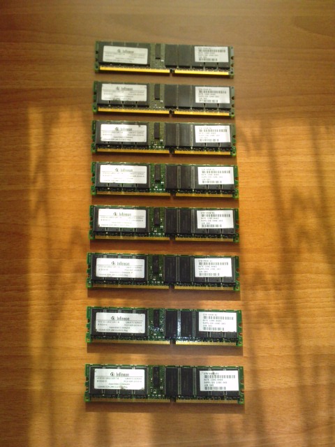 Vand 8 memorii Infineon de 1G DDR1 PC2100 ECC, REG. Memoriile sunt pentru servere si statii grafice, nu merg pe calculatoare normale.