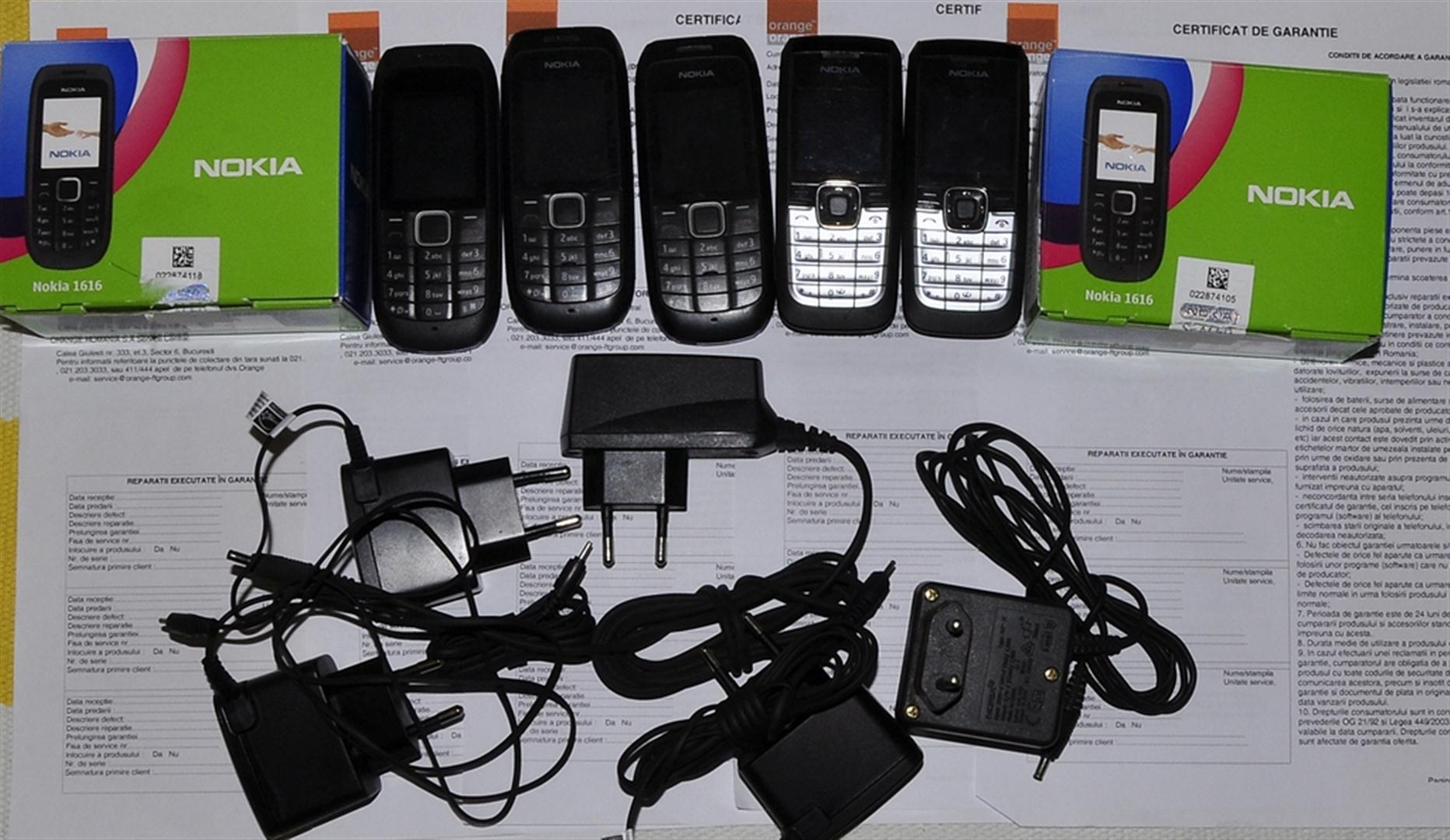 2 Nokia 1616 au cutie, incarcator, handsfree(unul nu), restul au doar incarcator, la fel si 2610.
