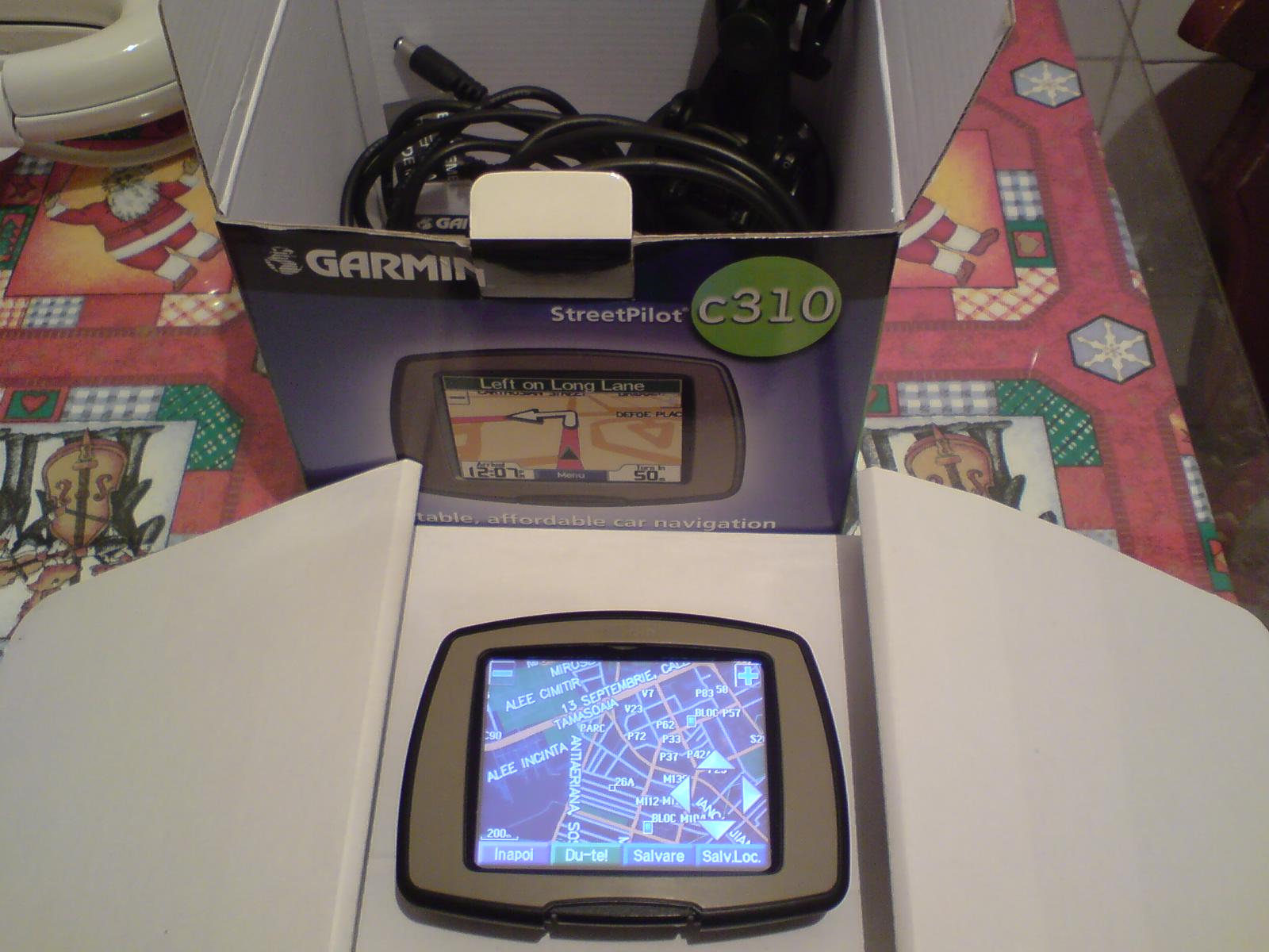 Pachetul contine: cutia, cablu usb, incarcator auto, suport parbriz, cd drivere, manuale, card SD 512mb si certificatul de garantie + factura+chitanta. Nu are nici o urma de folosire.