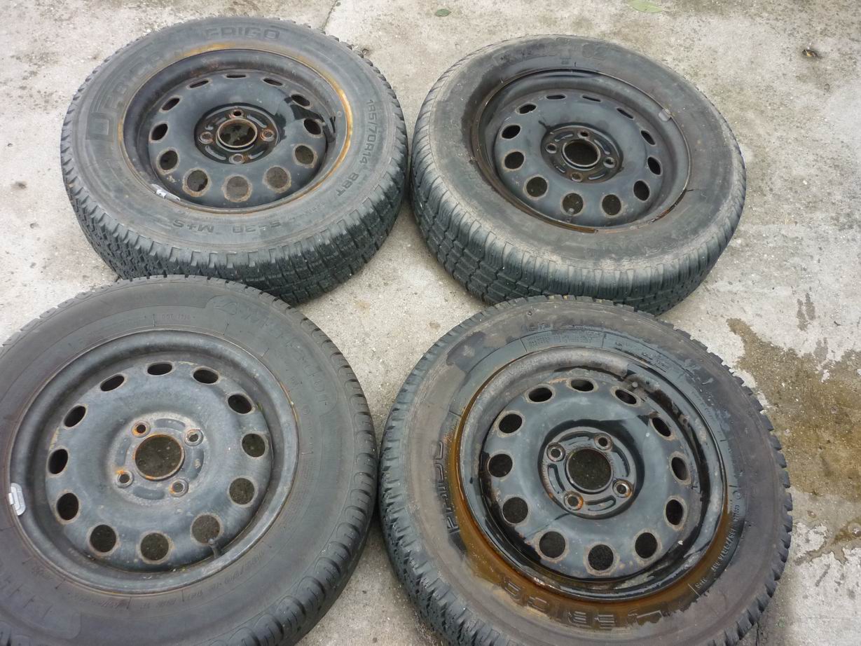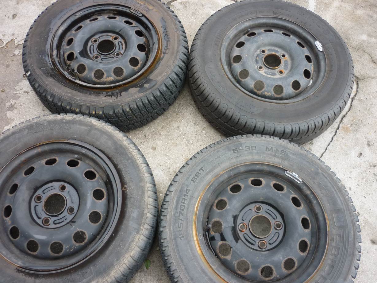 Pe jante sunt montate cauciucuri de iarna 3 (unul e pe pana) si unul de vara nou. Dimensiuni 185/70 R14. Cauciucurile de iarna sunt bonus la jante in cazul in care cumparatorul este interesat de ele, altfel se dau jos la vulcanizare, eu nu am ce face cu ele. Cauciucul de vara ramane la mine. Cauciucurile ramase nu sunt pereche, intamplarea a facut sa am pana la cauciucuri diferite.