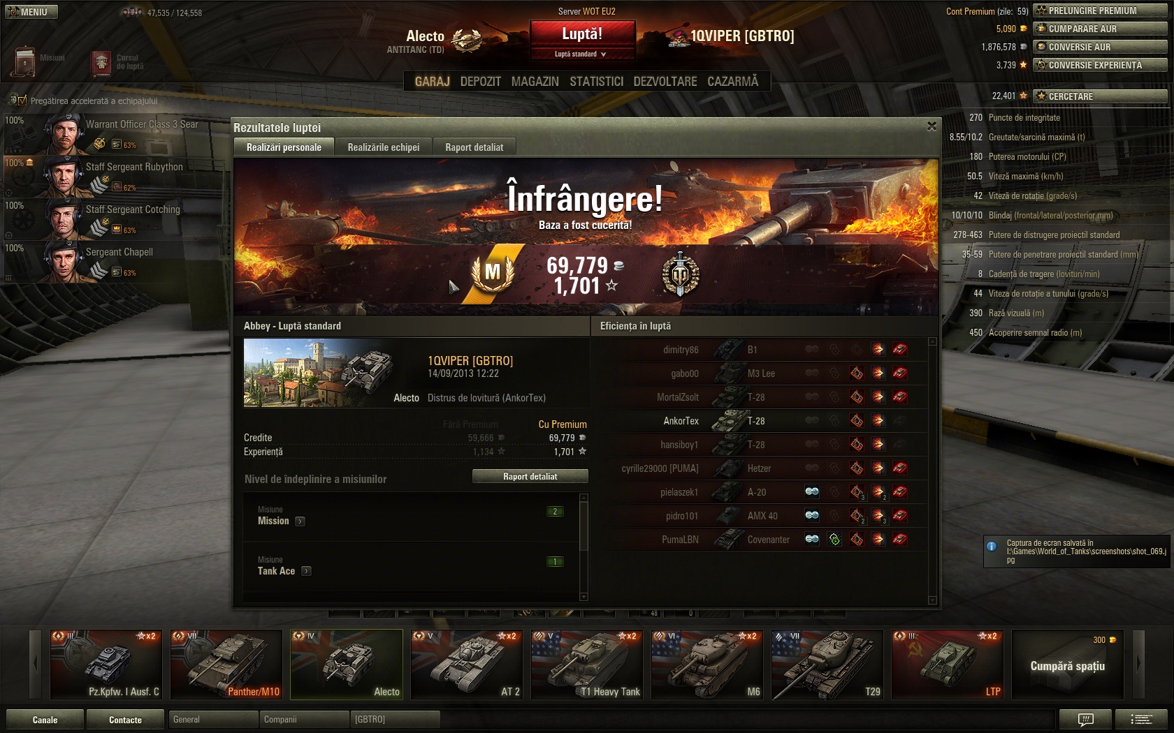 Nu multe, m-am "oprit" la Alecto si AT2 ca TD-uri, T1 Heavy si fratele mai mare M6 (recunosc, ma duc si spre T29) si Panther/M10. Mai someaza prin garaj un M3 Lee de plictiseala, un Sturmpanzer II de care abia astept sa scap si sa ajung mai sus si de ieri cadoul de la ei, LTP (care e haios mai ales in luptele pline de frati de ai lui