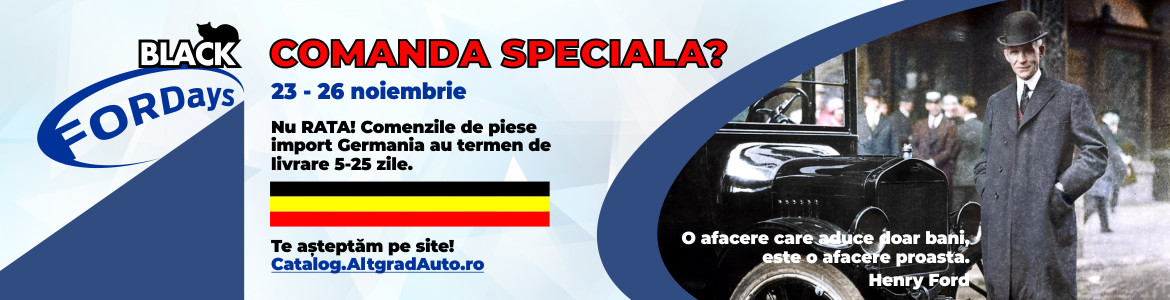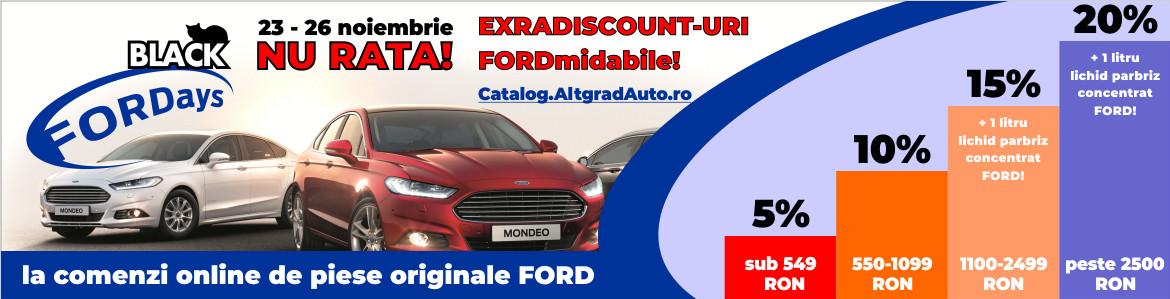http://WWW.Catalog.AltgradAuto.ro Aducem in prin plan pentru aceste zile de reduceri discounturi mai mari, ce pot fi cumparate online in 12 rate fara dobanda, gama completa Ford life style collection ceasuri, sapci, tricouri, scule Ford dedicate noii game din portofoliu Ford, si desigur piese originale Ford si accesorii. Anul acesta vom avea mai multe produse cu pret semnalizat ... promo’’ care pot fi piese de larg interes cum sunt volante, ambreiaje, injectoare, pompe injectie, jante aliaj, roti complete de iarna. Oferim pe langa pretul foarte bun la piesele de Ford si aftermarket DP extradiscount care se aplica pe cosul de cumparatori de maxim 20 %.