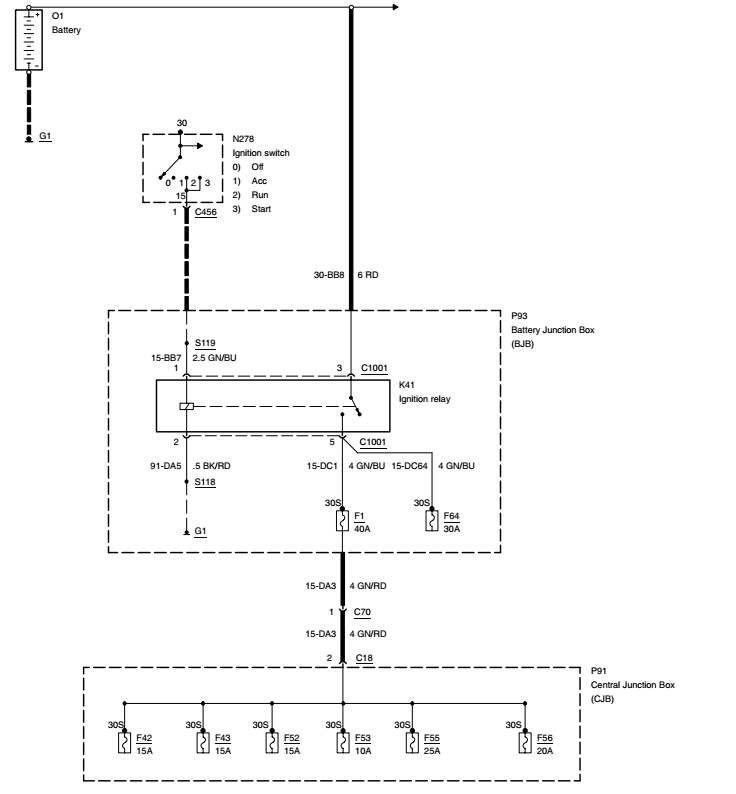 -releul K41 (ignition relay- releul aprinderii) din cutia din compartimentul motor se atrage doar la punerea contactului (ignition switch) iar prin contactul său se alimentează siguranțele F1 și F64 din aceeași cutie;