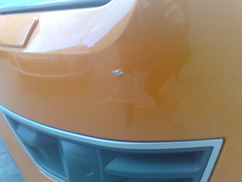 Acum 1,5 an stateam in traffic ... la un moment dat a venit unu pe contra sens si s-a bagat in fata, lovind masina mea. Nu vroiam sa o fac, pentru ca atunci era o zgariatura mica si mie era frica de specialisti din Romania sa nu imi strica culorea. Am last-o asa ...
