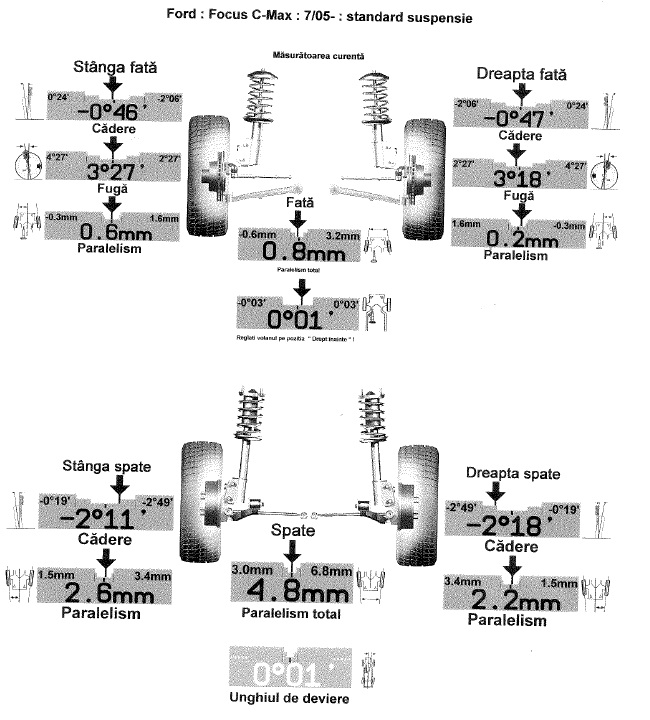 La Focus intradevar se regleaza numai convergenta, acel TOE. Daca la aducerea masinii intre valorile normale ale convergentei nu se obtin si celelalte unghiuri corecte, atunci este problema. Unghiuri corecte se pot obtine chiar si la masini cu mici probleme la sasiu dar tine si de indemanarea mecanicului si de cat de tare e strambata masina.